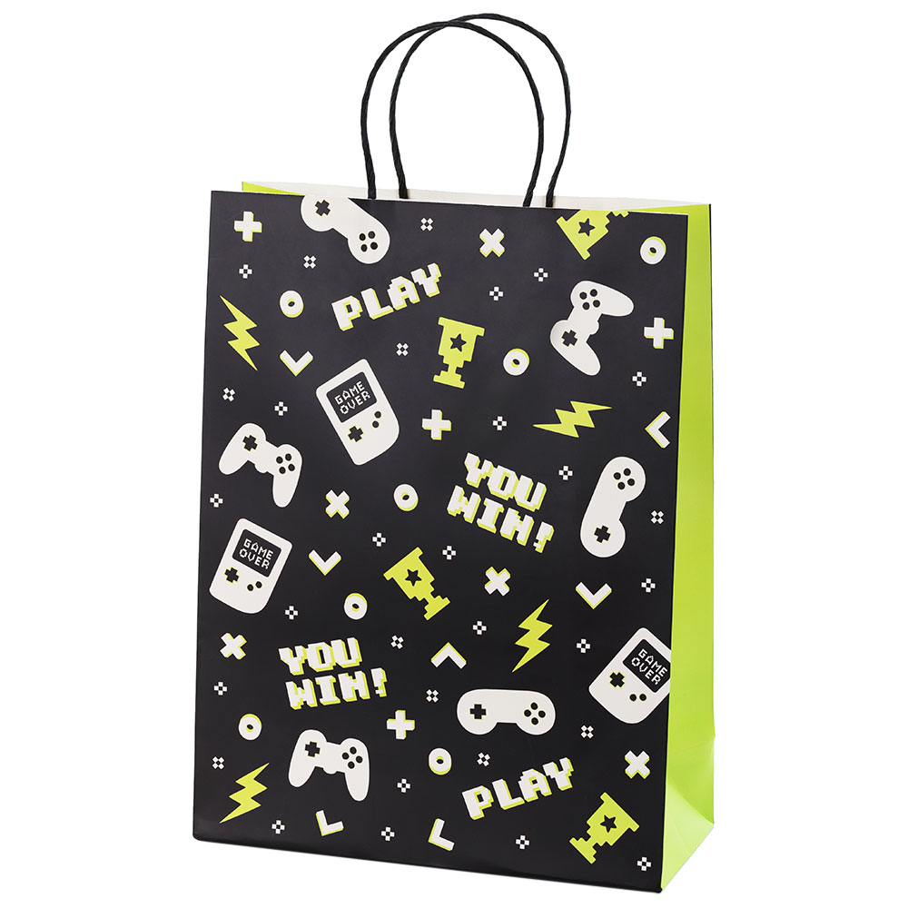 Gamer Presentpåse Svart omfattar en svart presentpåse med handtag, dekorerad med spelkontroller, retro handhållen konsol med texten "GAME OVER", utspridda knappar, blixtar, pokaler samt texterna "PLAY" och "YOU WIN!" i färgerna limegrön och vit.