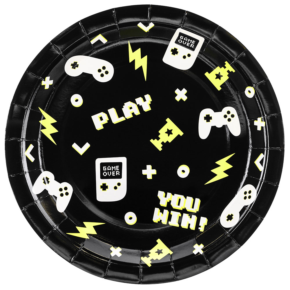 Gaming Papperstallrikar Svart 23 cm består av sex papperstallrikar med gaming motiv. Varje tallrik är dekorerad med spelkontroller, retrohandhållen konsol med texten "GAME OVER", utspridda knappar, blixtar, pokaler samt texterna "PLAY" och "YOU WIN!" i färgerna limegrön och vit mot en svart bakgrund.