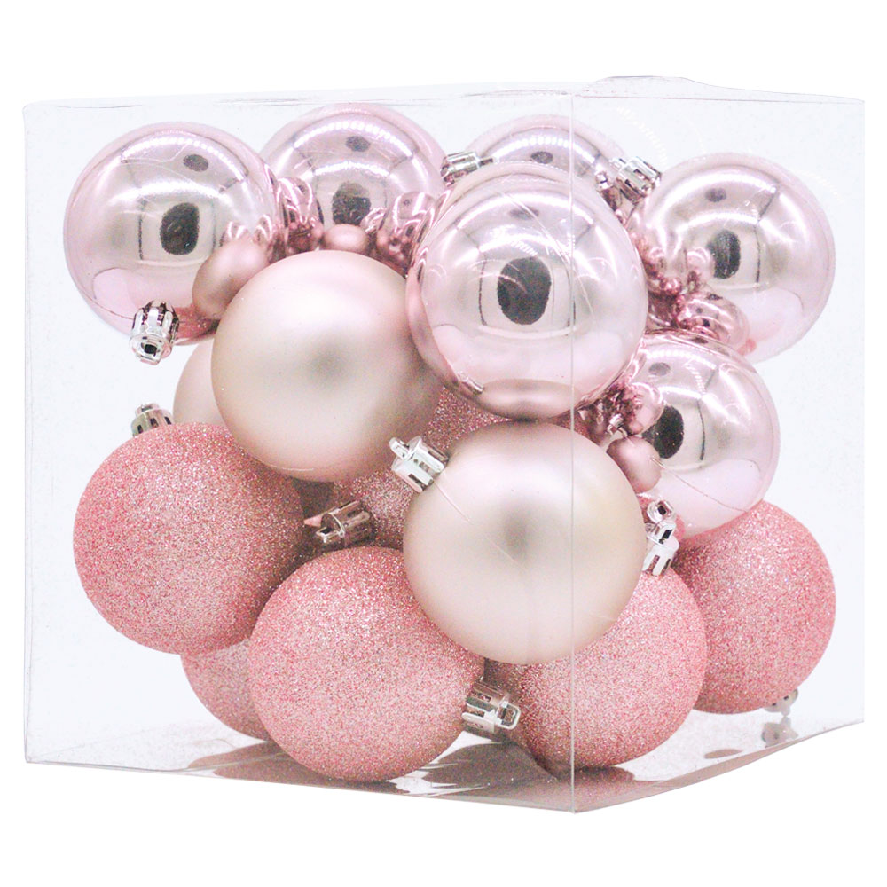 Gammelrosa Julkulor 20-pack omfattar 20 st blanka, matta och glittriga julgranskulor i gammelrosa nyans. Julkulorna är i plast och mäter ca 6 cm i diameter.