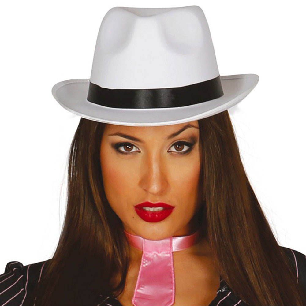 Gangsterhatt Premium Svart/Vit omfattar en vit fedorahatt med ett svart band runt om.