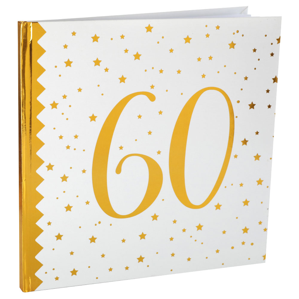 Gästbok 60 År Stjärnor omfattar en vit gästbok med guldigt 60-års motiv. Boken är ca 24 x 24 cm stor och innehåller 20 stycken blanka sidor att skriva på. Tillverkad av papp.