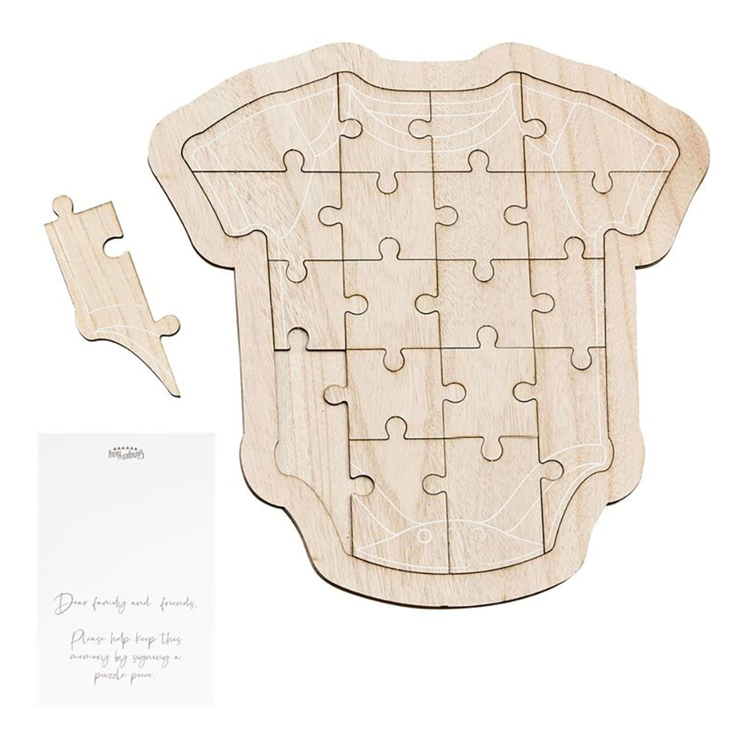 Gästbok Babyshower i Trä är en fiffig gästbok i form av ett pussel format som en bebis-body. Gästerna kan skriva korta meddelanden och hälsningar på de 18 pusselbitarna och på så sätt skapa ett dekorativt minne.