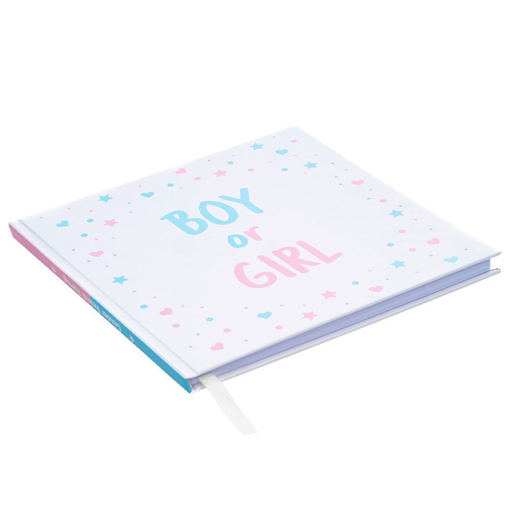 Gästbok Boy or Girl omfattar en vit gästbok med gender reveal motiv. Framsidan är dekorerad med blåa och rosa hjärtan, stjärnor, prickar samt texten "Boy or Girl".