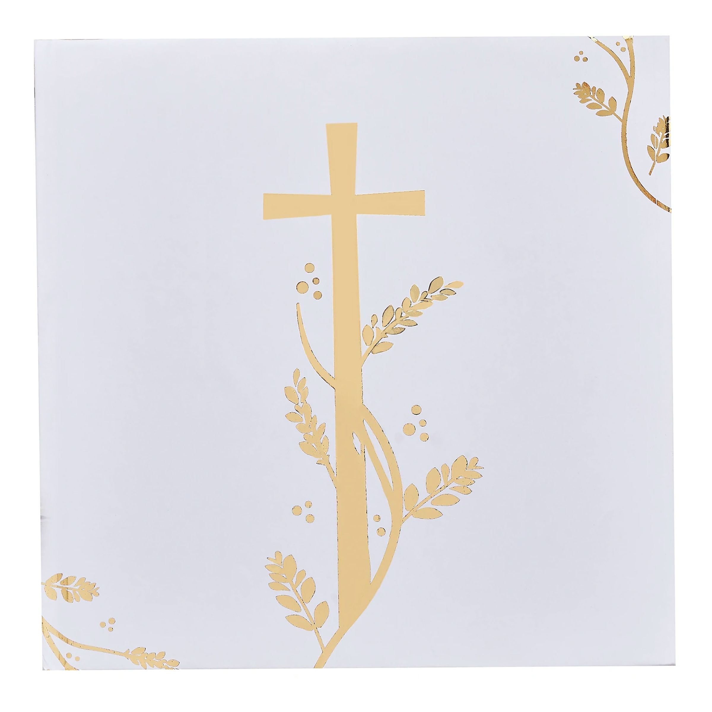 Gästbok Konfirmation Guld inkluderar en gästbok med blanka sidor. Framsidan pryds av ett kors i guld med vackra dekorationer som sveper runt korset.