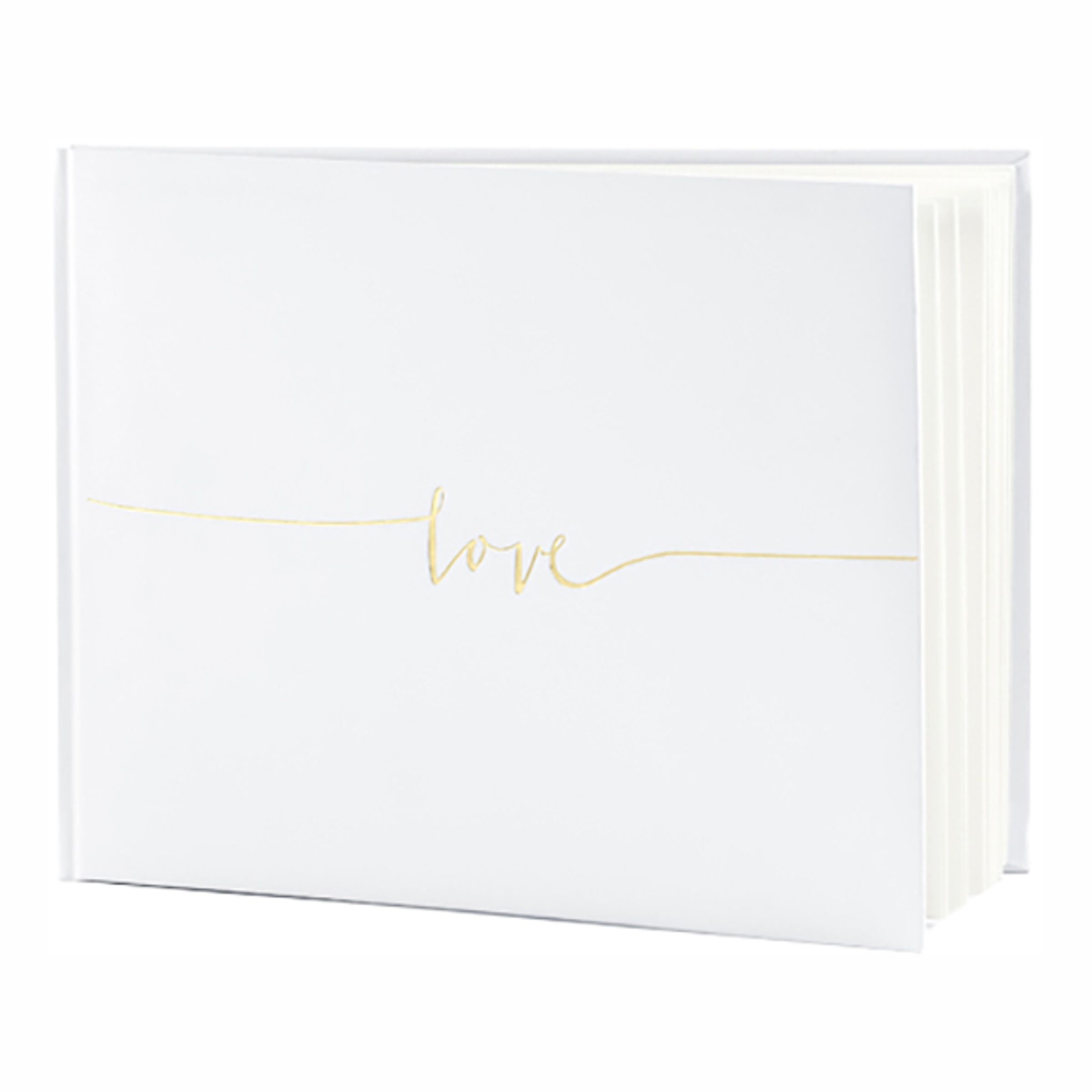 Gästbok Love Guld är en vit gästbok i papper som mäter ca 24 x 18.5 cm med 22 helvita sidor. Framsidan pryds av ordet "love" i guldfärg.