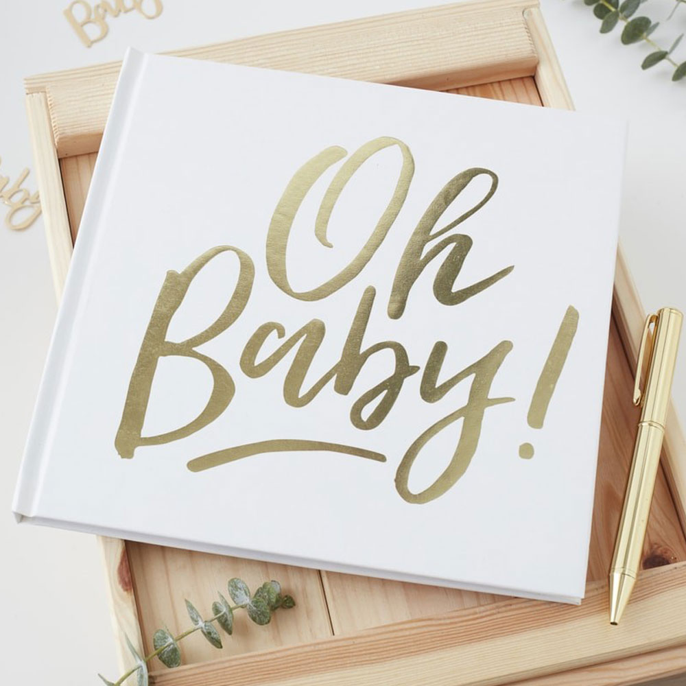 Gästbok Oh Baby är en gästbok med 32 blanka sidor, som passar perfekt till en baby shower. Boken är vit med guldig "Oh Baby!" text på framsidan. Låt dina gäster skriva ett gott råd, ett fint citat eller kanske något annat roligt i boken under din baby shower.