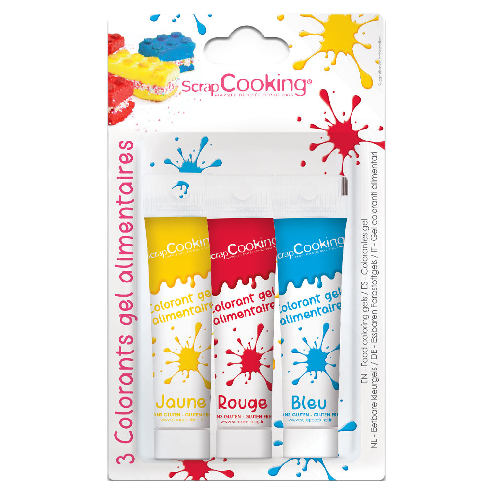 Gelefärg Färgmix ScrapCooking omfattar tre stycken tuber med ätbar gelfärg i rött, blått och gult. Används till färgning av tårtor och bakverk och färgar utan att påverka konsistensen. Varje tub innehåller 20 gram gelfärg.