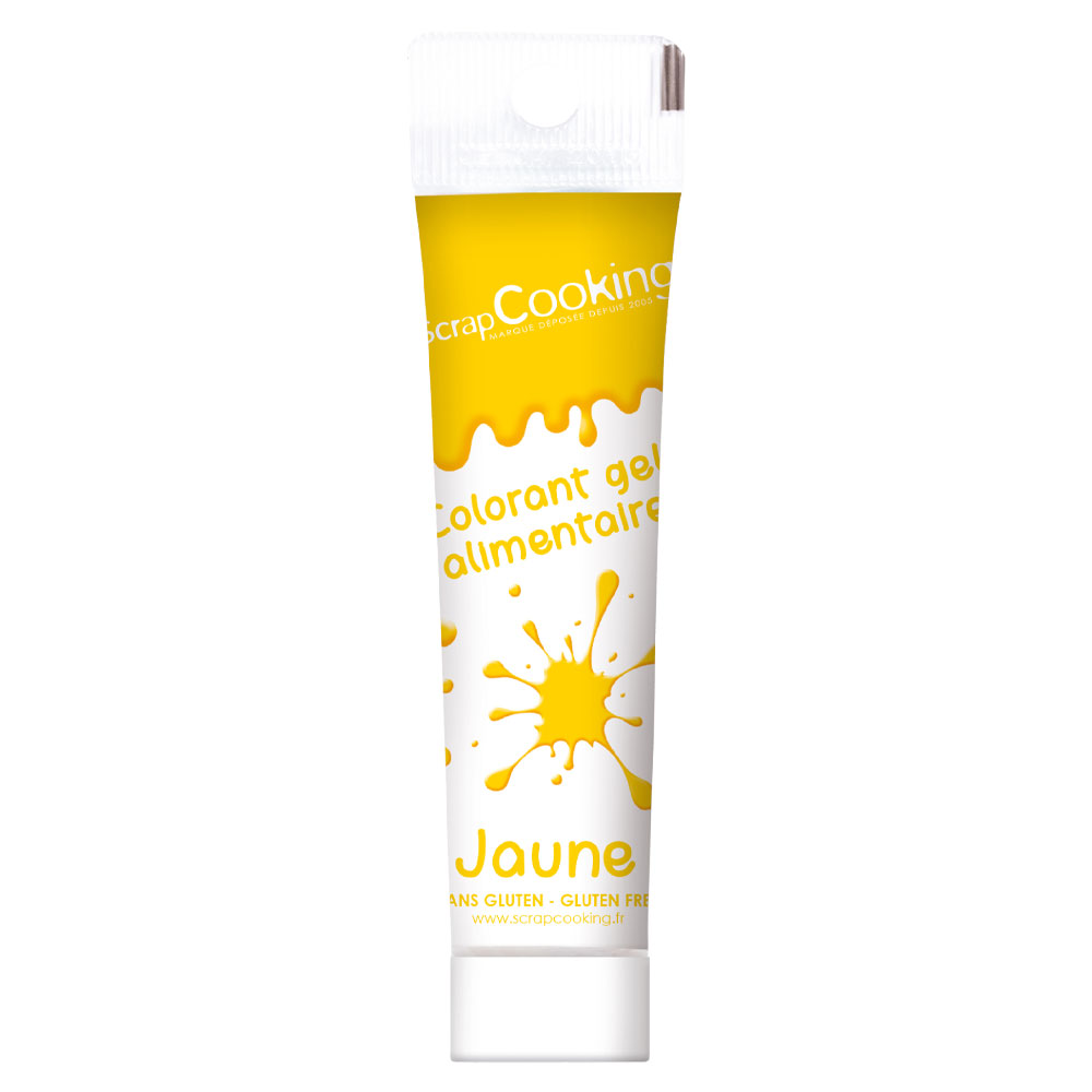 Gelefärg Gul ScrapCooking omfattar gul ätbar färg till färgning av tårtor, kakor, glasyr, deg och smet. Färgar utan att påverka konsistensen. Kommer på tub om 20 gram.