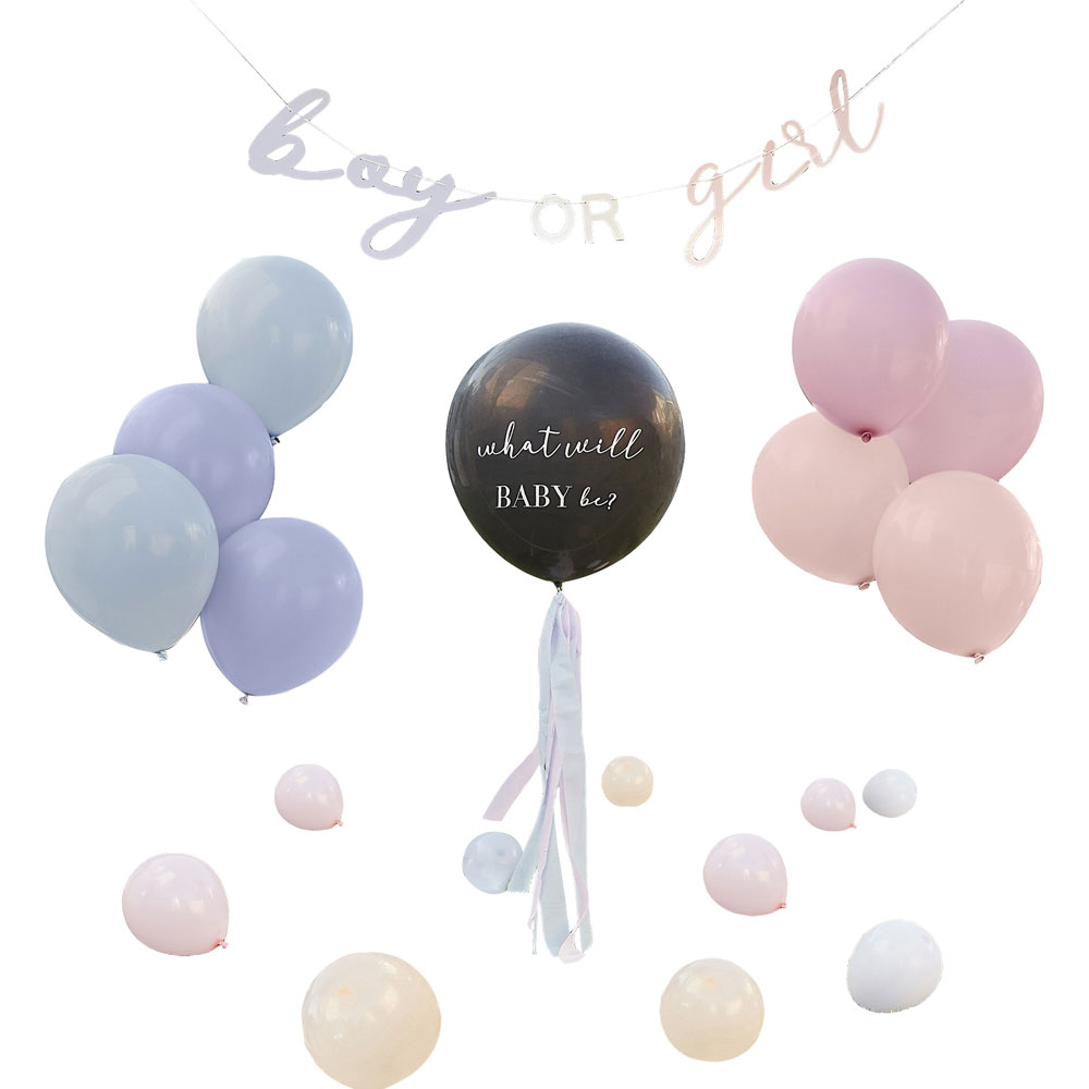 Gender Reveal Kit Hello Baby omfattar ett stort kit med dekorationer för babyshower eller gender reveal fest. Kitet består av en "Boy or Girl" girlang, en stor, svart gender reveal ballong med texten "What Will Baby Be?", 20 st ballonger i olika nyanser av blått och rosa samt blå och rosa konfetti. Ballongerna och konfettin är även biologiskt nedbrytbara.