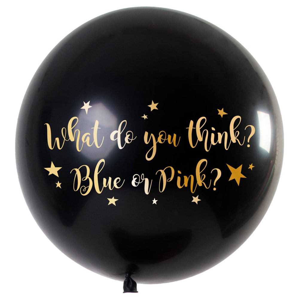Gender Reveal Konfettiballong Rosa omfattar en metallic svart ballong med texten "What do you think? Blue or pink?" i guld. Ballongen har rosa konfetti inuti.