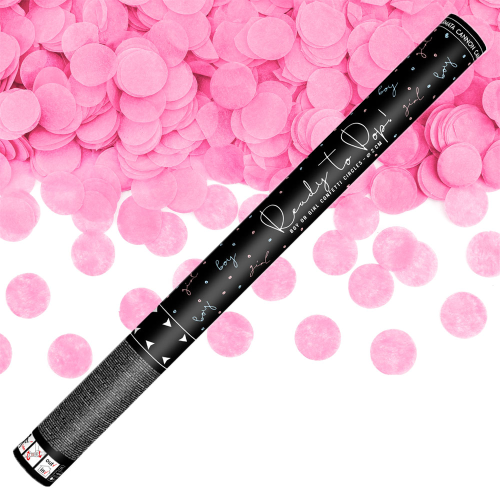 Gender Reveal Konfettikanon Rosa omfattar en ca 60 cm stor, svart konfettikanon med rosa konfetti inuti. Konfettin är tillverkad av papp.