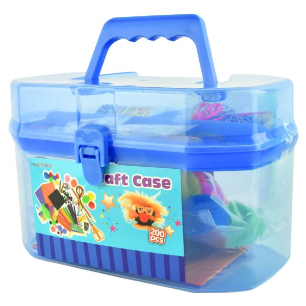 Genomskinlig Pyssellåda Blå omfattar ett pysselkit med 200 pysseltillbehör som kommer i en blå transparent förvaringslåda i två våningar med lock och handtag. I pyssellådan hittar du en rad olika pynt som till exempel pärlor, piprensare, glitter, färgade glasspinnar, textilbollar, paljetter, roliga ögon och flytande lim mm.
