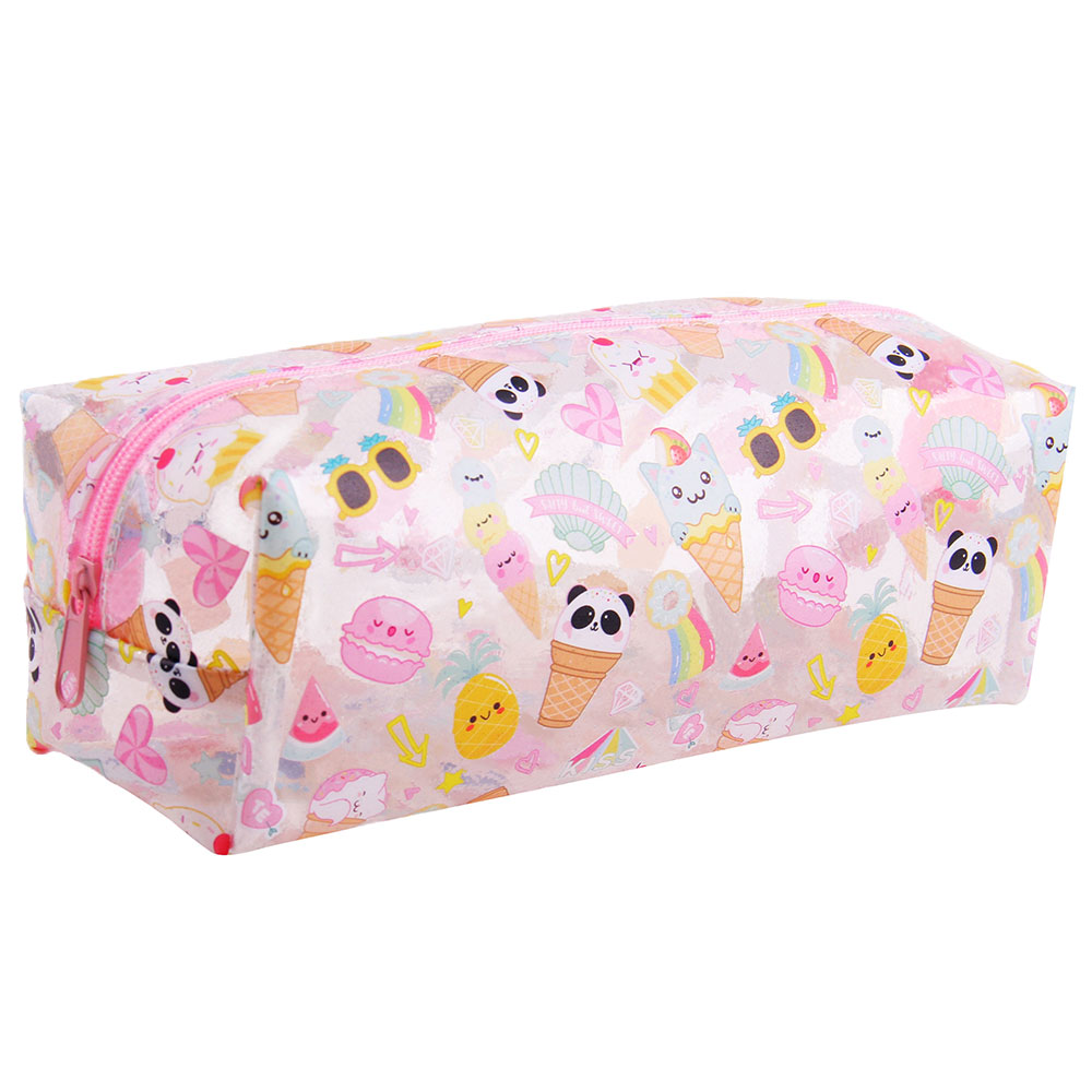 Genomskinligt Pennfodral med Tryck omfattar ett genomskinligt pennfodral tillverkat av plast, dekorerat med olika färgglada bilder, såsom glass, muffins, frukt, regnbåge, stjärnor, hjärtan, diamanter, pilar, djur och solglasögon.