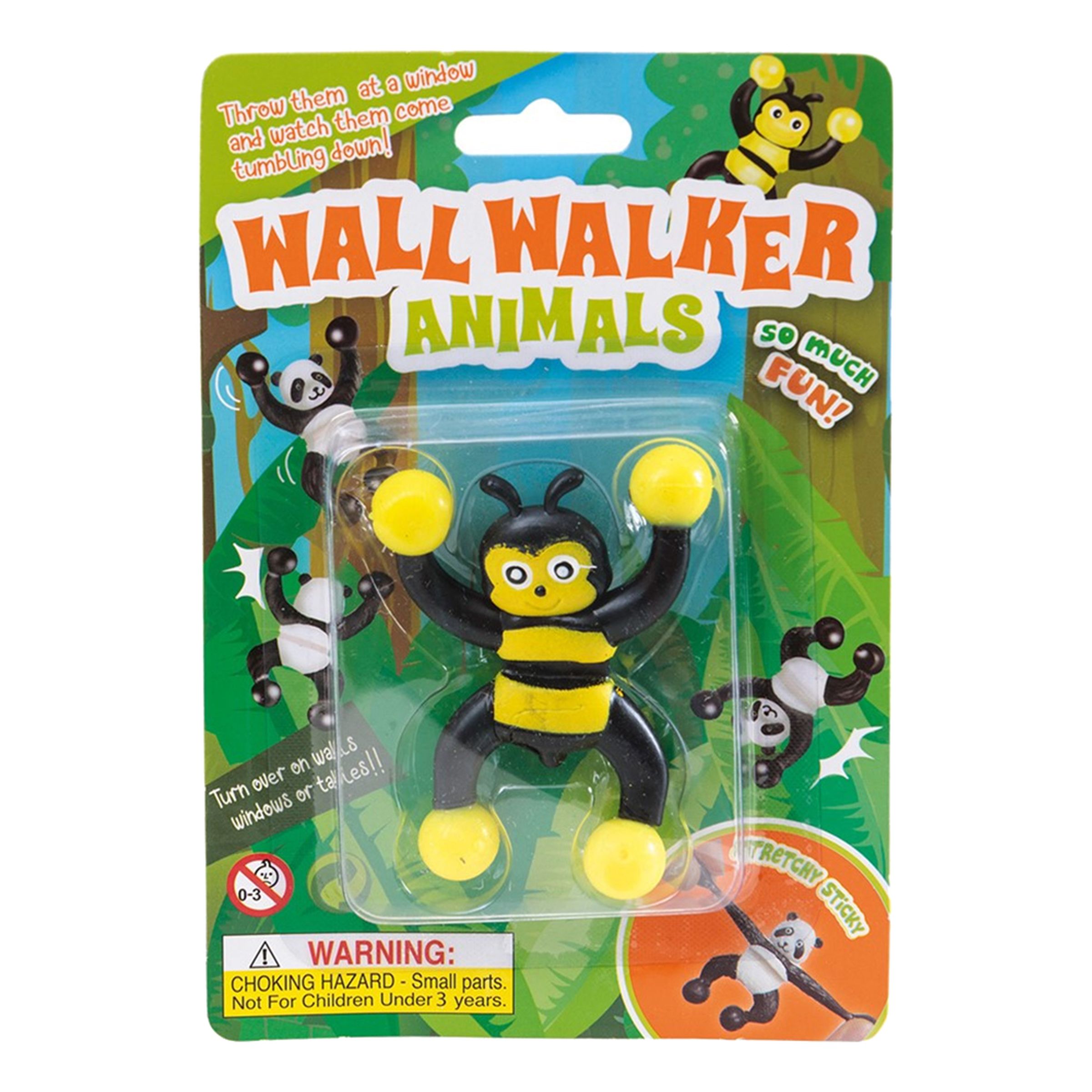 Geting Wall Walker är en gul och svart liten geting som du kan slänga mot en vägg eller ett fönster för att sedan långsamt se den klättra neråt. Getingen är tillverkad i plast och den är 5 x 6 cm stor. Rekommenderad ålder är från 3 år.