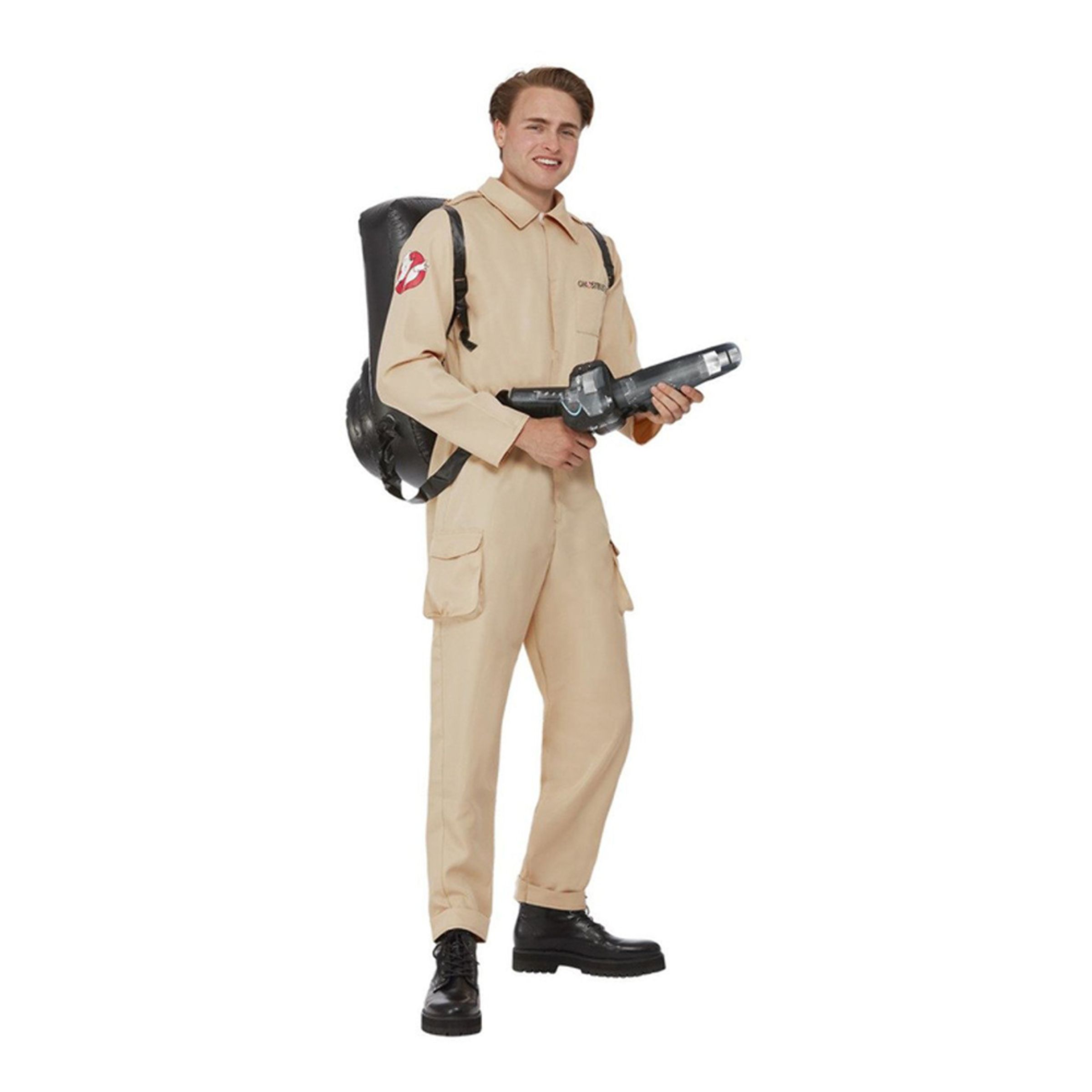 Ghostbusters Herr Maskeraddräkt inkluderar en beige overall med Ghostbuster-loggan på ärmen och en uppblåsbar ryggsäck med en spökdammsugare. Maskeraddräkten är tillverkad i polyester och plast och finns i fyra olika storlekar till herr.