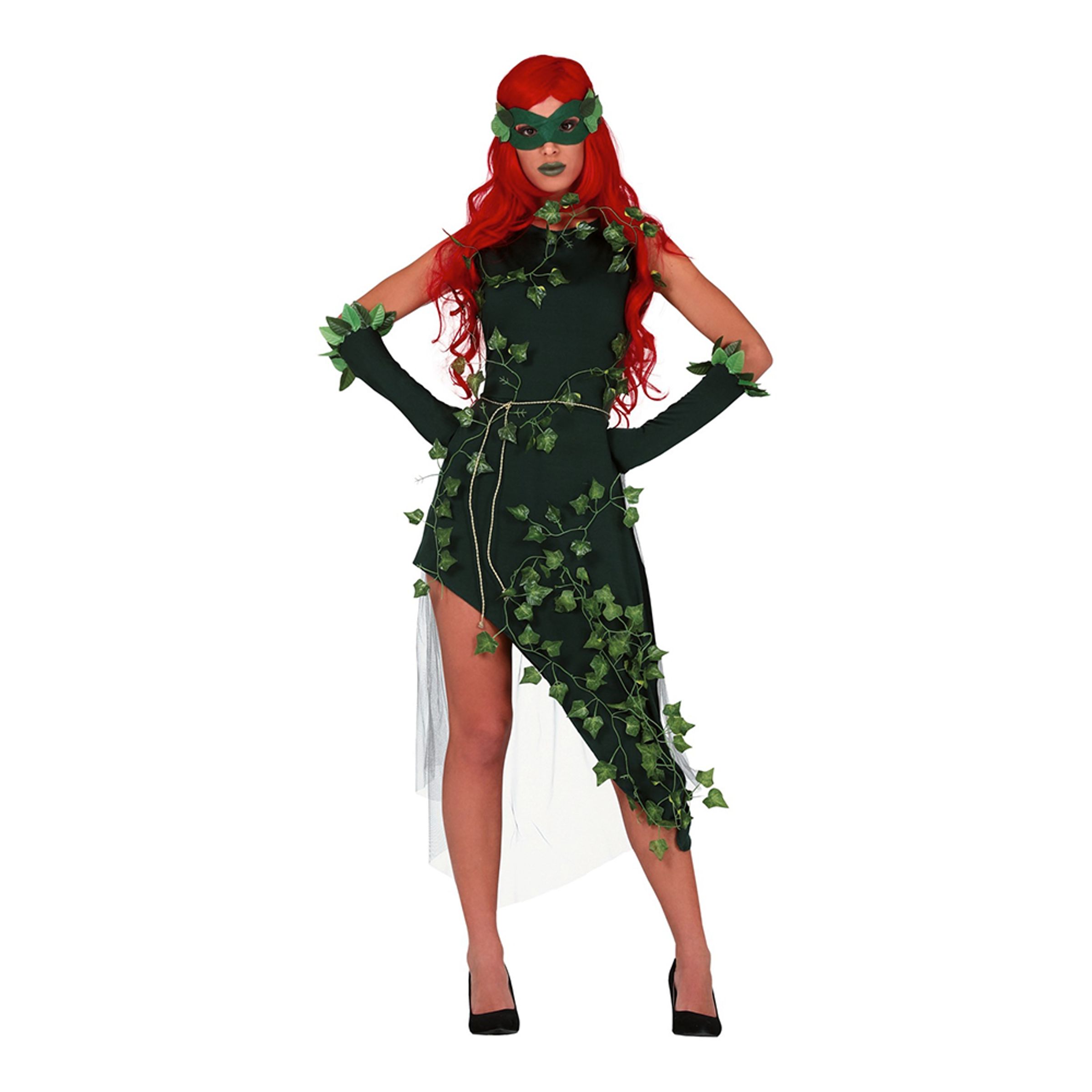 Giftig Växtkvinna Maskeraddräkt inkluderar en grön klänning, handskar, ögonmask och ett smalt bälte. Dräkten är täckt i slingerväxter. Kommer i damstorlekarna small, medium och large.