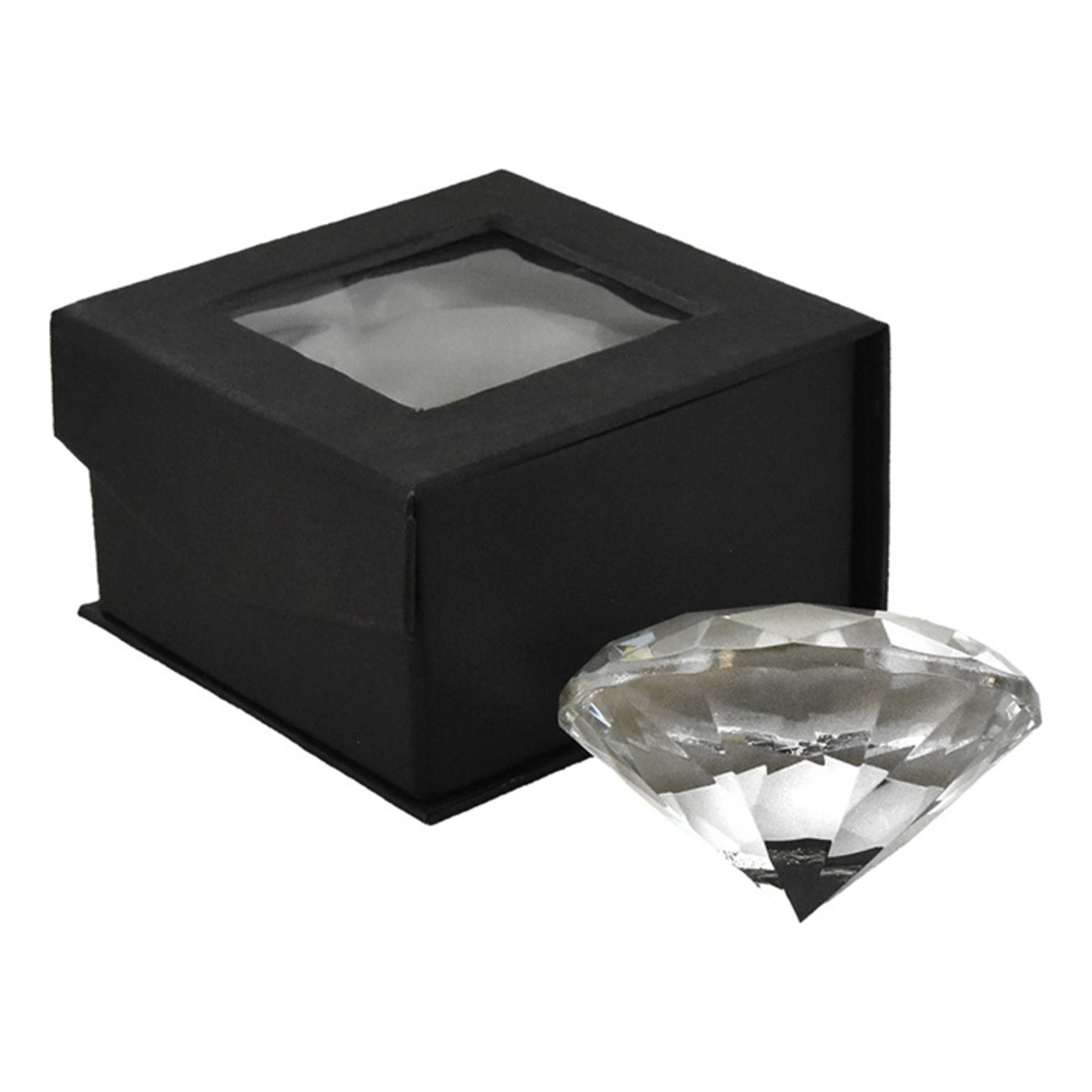 Stor diamantformad sten i en snygg svart presentask och inlindad i en vit sammetslen duk. Rolig leksak för barn eller en annorlunda present att ge bort till den som redan har allt.