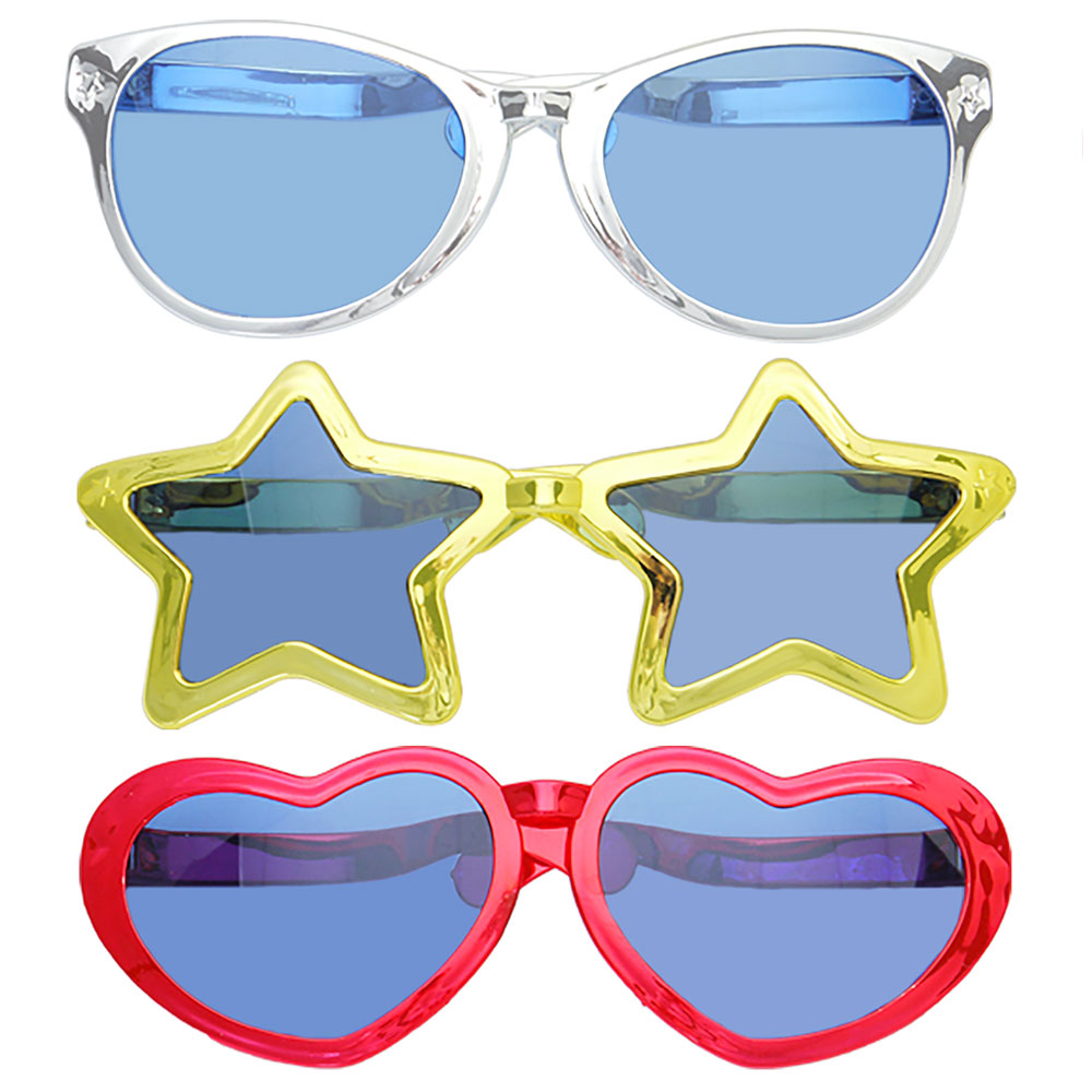 Gigantiska Formade Solglasögon omfattar tre olika varianter av gigantiska partyglasögon och blå tonade glas av plast. Finns antingen formade som en stjärna i guld, ett hjärta i rött, eller som en cirkel i silver. Solglasögonen säljs osorterade och styckvis så det blir en överraskning om vilken variant du får.