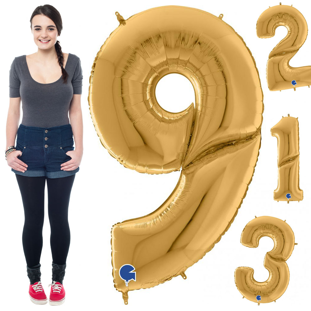 Gigantiska Sifferballonger Guld omfattar enorma sifferballonger i guld som finns att välja mellan siffrorna 0-9. Ballongerna har 2 olika delar som kan fyllas med helium eller luft.