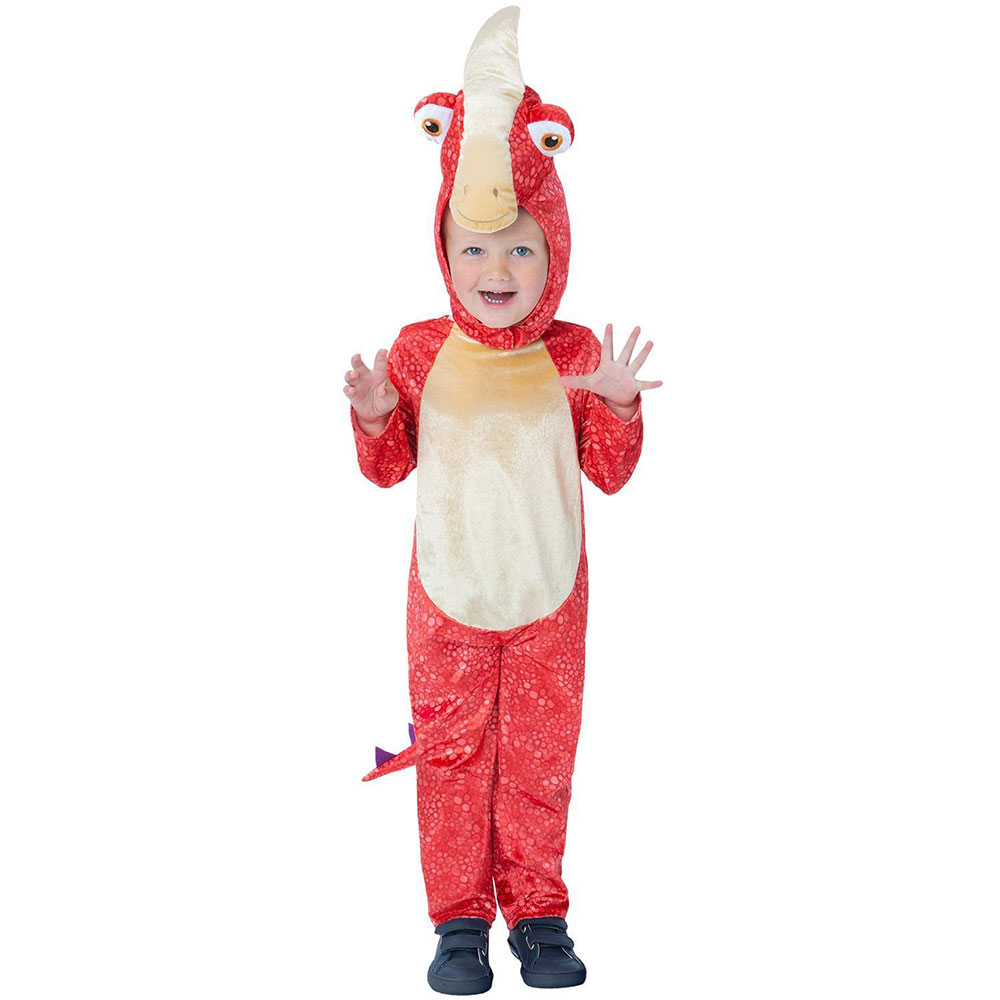 Gigantosaurus Rocky Dinosauriedräkt Barn omfattar en orange jumpsuit med en huva i ett mjukt material som är formad som karaktären Rocky från Gigantosaurus. Jumpsuiten har en fylld svans och huvans topp pryds av ett fyllt dinosauriehuvud.