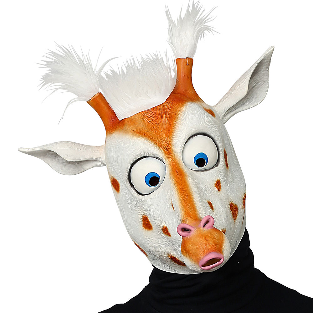 Giraff Helmask med Hår omfattar en heltäckande djurmask i form av en vit giraff med oranga fläckar och vitt hår på huvudet och på hornen.
