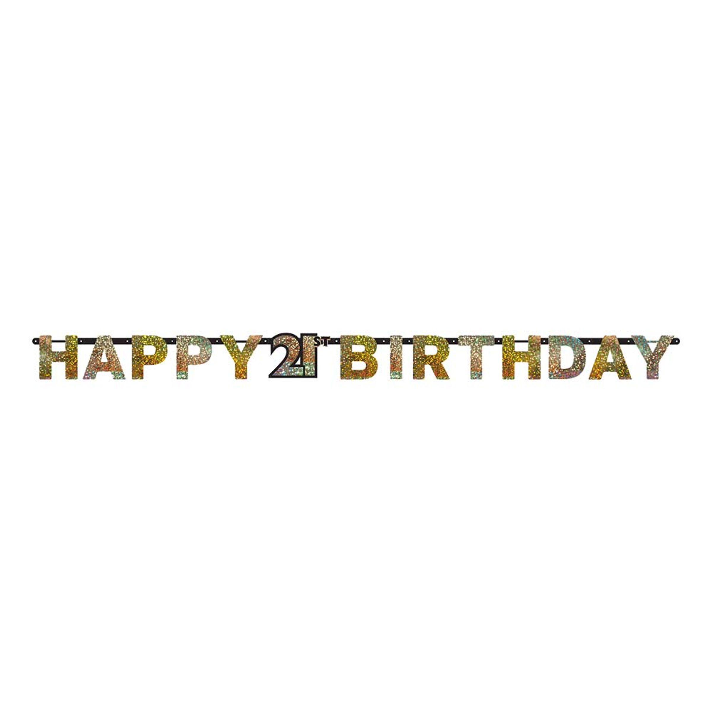 Girlang 21 Happy Birthday Guld Glitter är en festlig girlang i guld och svart med texten "Happy 21th Birthday". Perfekt till födelsedagsfirandet!