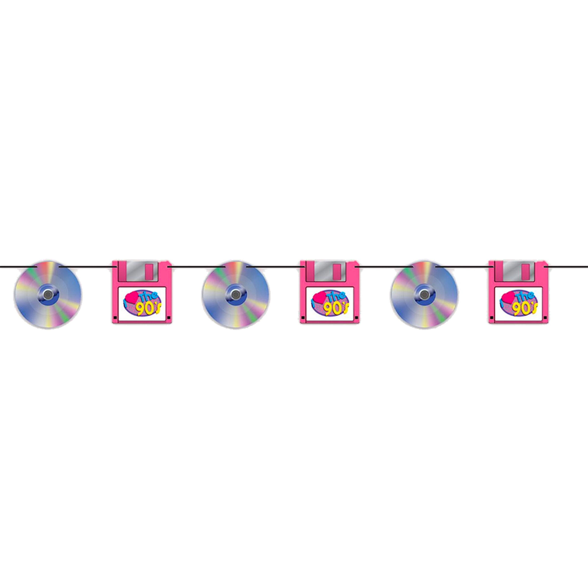 Girlang 90s Party innehåller en girlang med skivor och disketter, precis som på 90-talet. Girlangen är tillverkad i papper och kräver enklare montering.