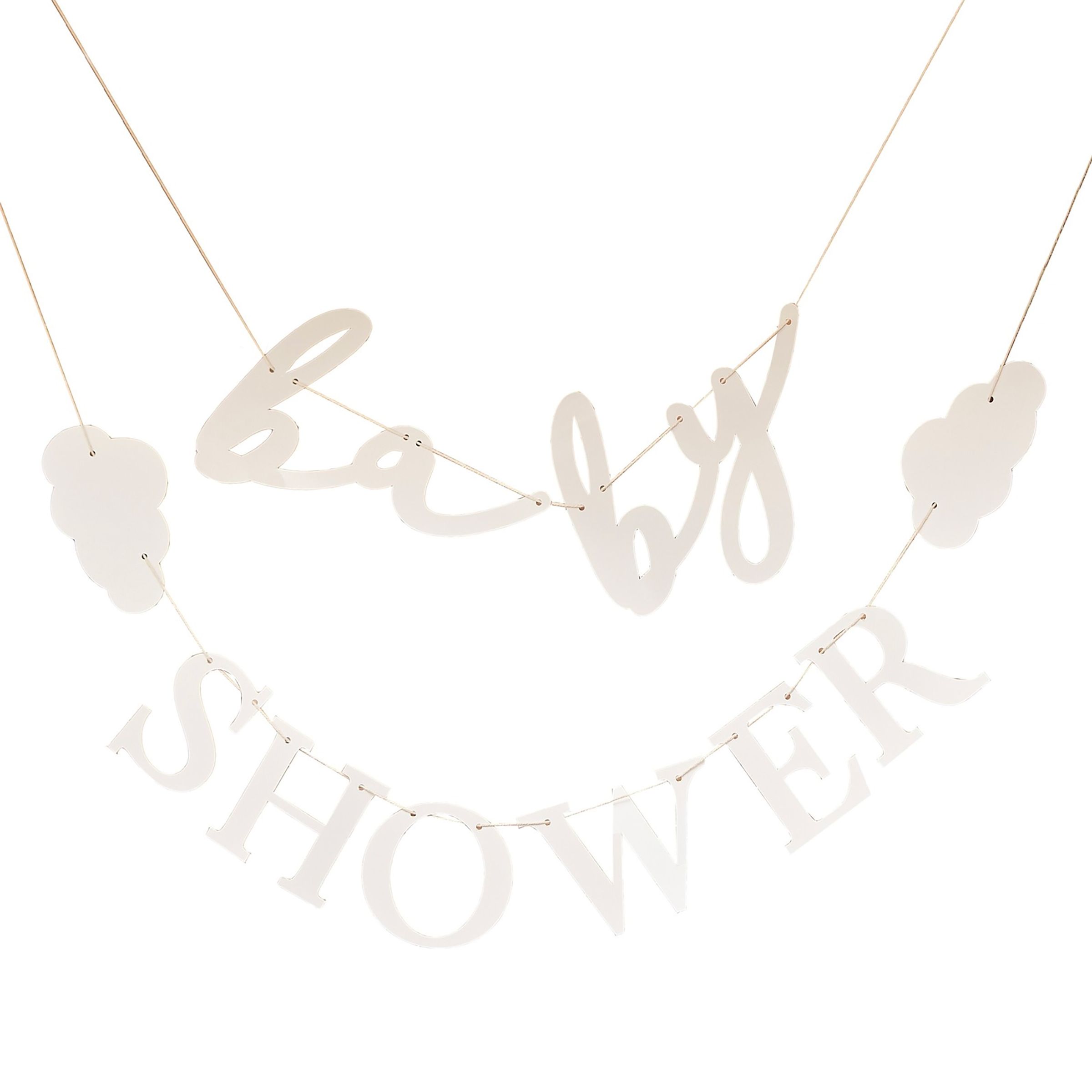Girlang Baby Shower Moln innehåller två girlanglängder som båda mäter 1,5 meter. Bokstäverna är tillverkade i papper.