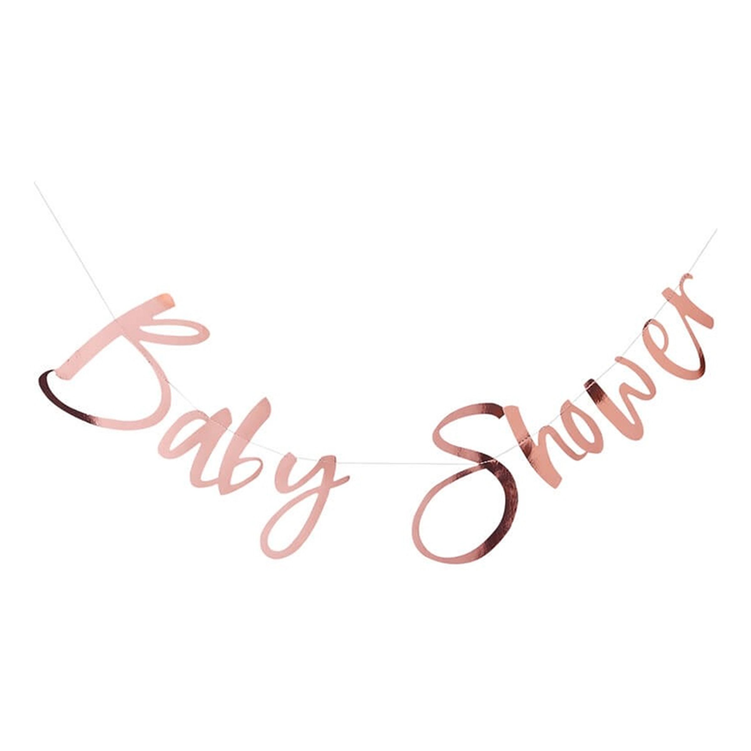 Girlang Baby Shower Roséguld Metallic innehåller en girlang med roséguldfärgade bokstäver som bildar orden "Baby Shower". Girlangen är 1 x 1,5 meter och snöre för enkel upphängning ingår i förpackningen.