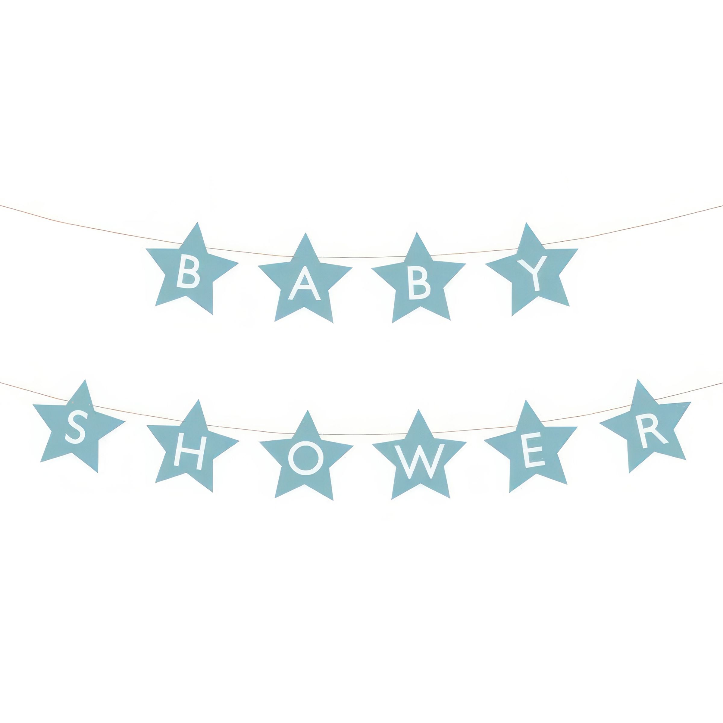 Girlang Baby Shower Stjärnor Blå är en girlang som består av blåa stjärnor med texten "Baby Shower". Hängs enkelt upp med en bit tejp eller mellan två krokar, exempelvis.