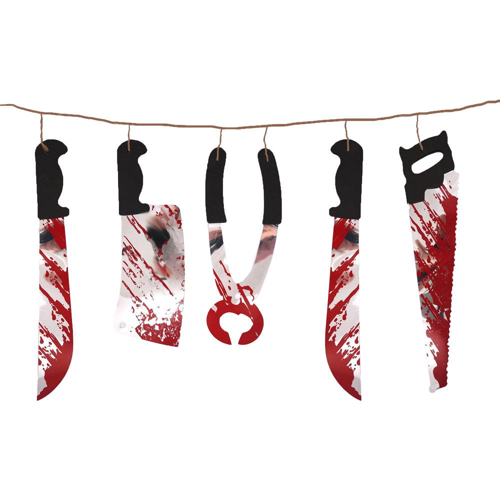 Halloween är här och nu är det dags att förvandla ditt hem till ett läskigt skräckhus! Med denna halloween girlang i taket skapar du enkelt en passande dekoration till ditt mardrömslika tema. Kusligt halloween pynt med hängande verktyg med blod på som avslöjar att de kanske har använts till något helt annat än vad de är till för. Perfekt för alla som vill få till en skrämmande stämning!