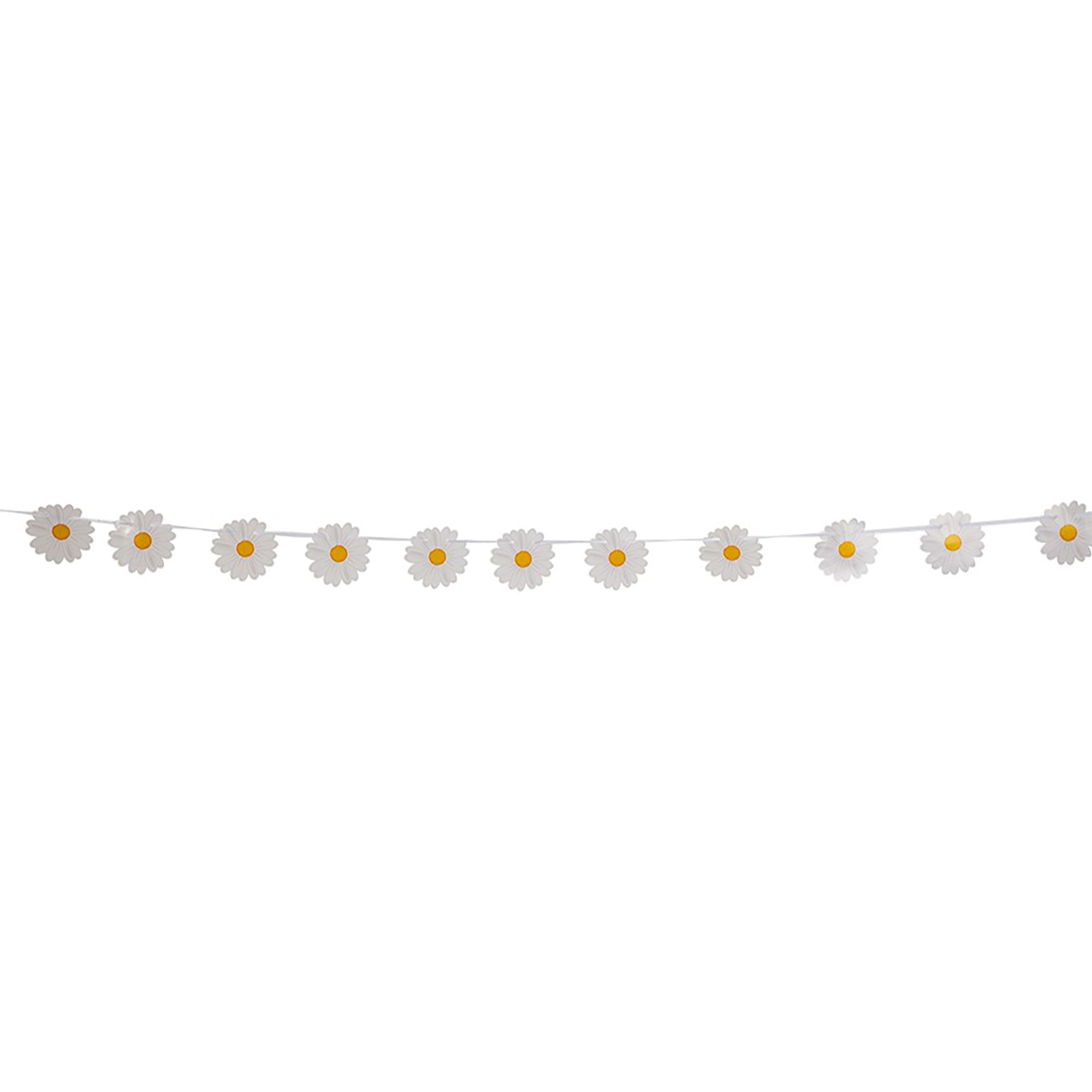 Girlang Blommor Prästkrage är en vit girlang med vimplar formade som små prästkragar. Girlangen har totalt 15 stycken prästkragar och hängs enkelt upp med en tejpbit eller liknande.
