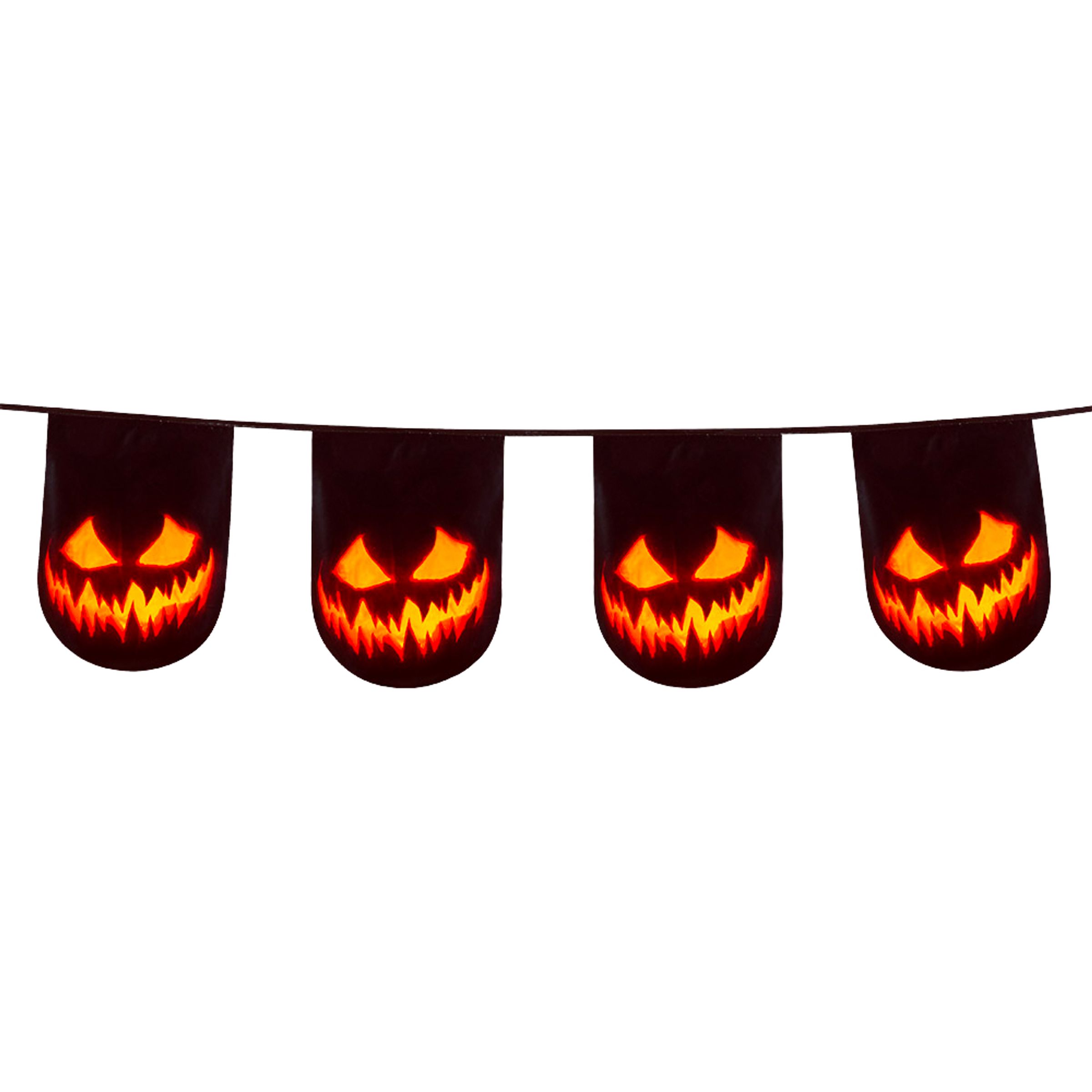 För ett komplett tema av läskiga pumpor krävs även girlanger! Häng upp den här på halloweenfesten och matcha med dukning och ballonger i samma motiv – allt för en maxad halloweenstämning.