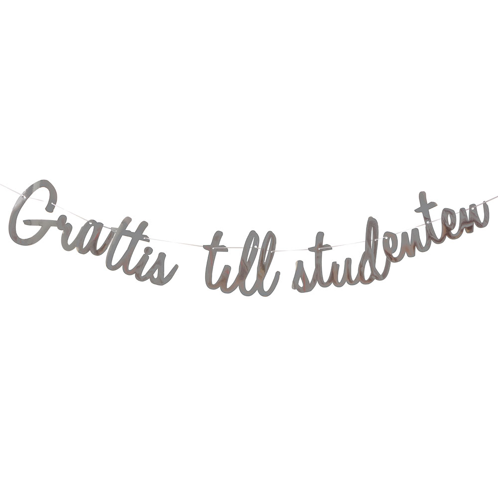 Girlang Grattis Till Studenten Silver består av en silvrig girlang med texten "Grattis till studenten" i skrivstil. Bokstäverna sitter fast på ett vitt band som även kan användas vid upphängning. Tillverkad i papp.