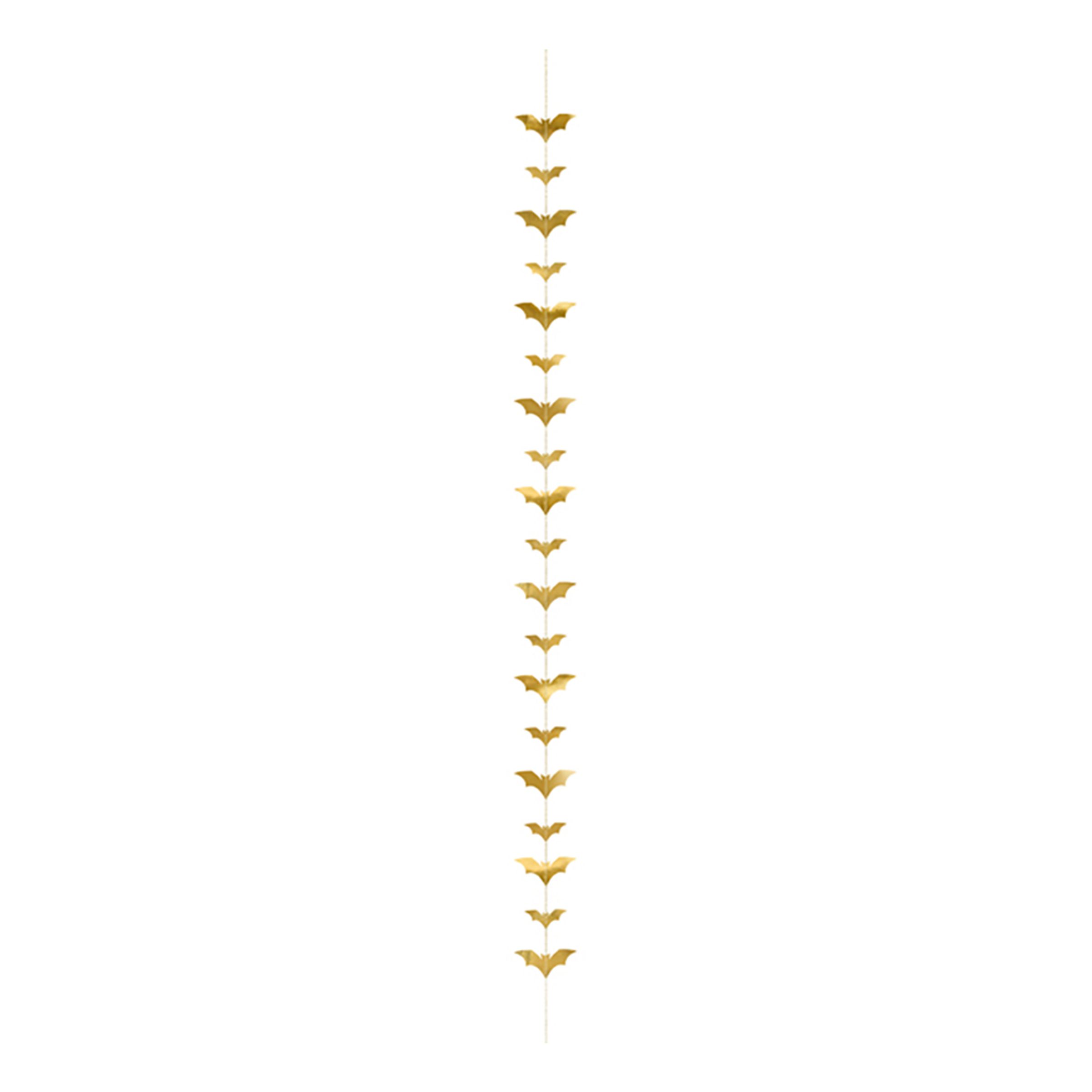 Girlang Guld med Fladdermöss är en girlang med små utklippta fladdermöss tillverkade i guldfärgat papp. Girlangen är 150 cm lång och hängs enkelt upp på en krok eller med hjälp av lite tejp. Det är bara girlangen som ingår, inget annat som syns på bilden.