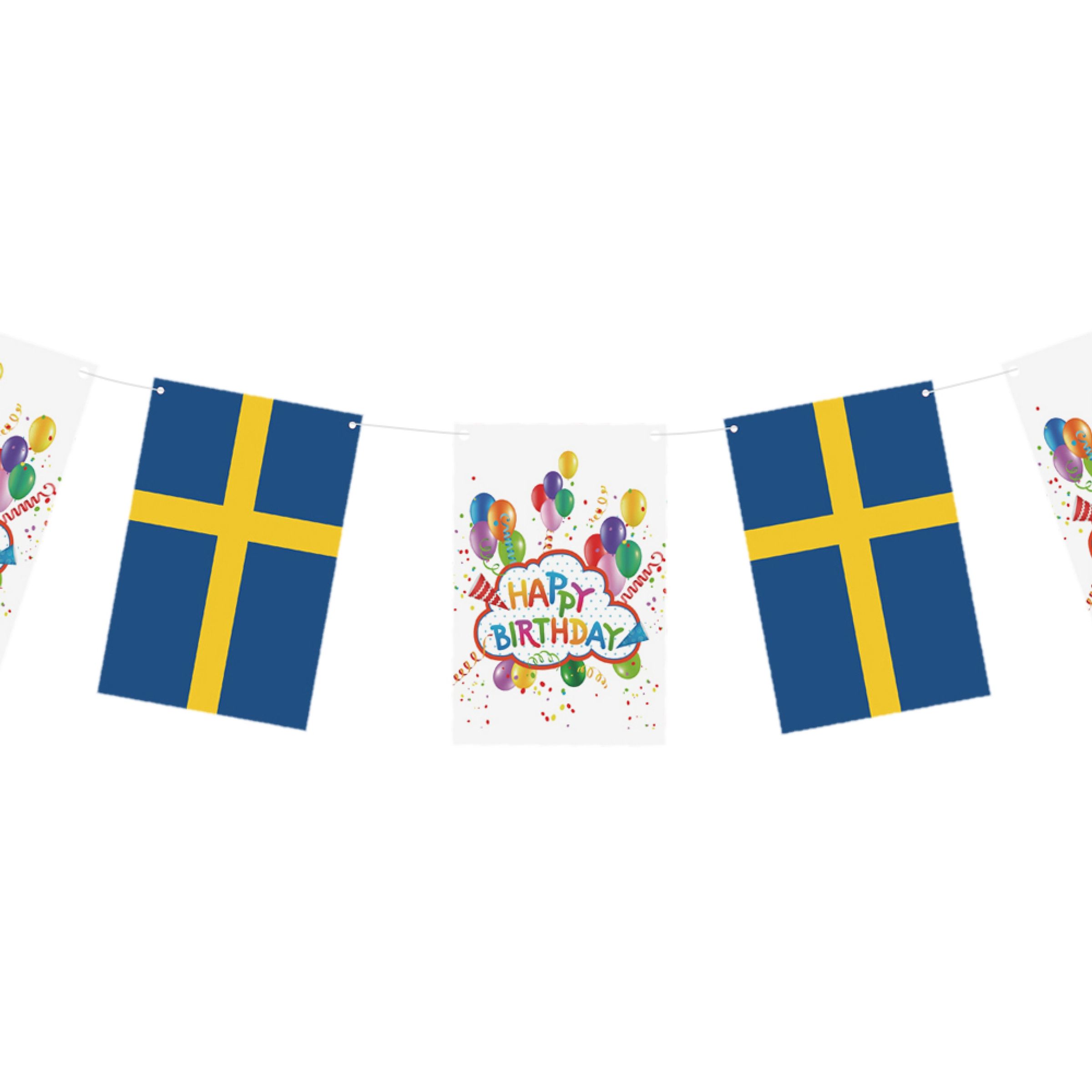 Girlang Happy Birthday är en girlang blandat med sverigeflaggor-vimplar och "Happy Birthday"-vimplar. En festlig detalj att dekorera med på födelsedagskalaset!