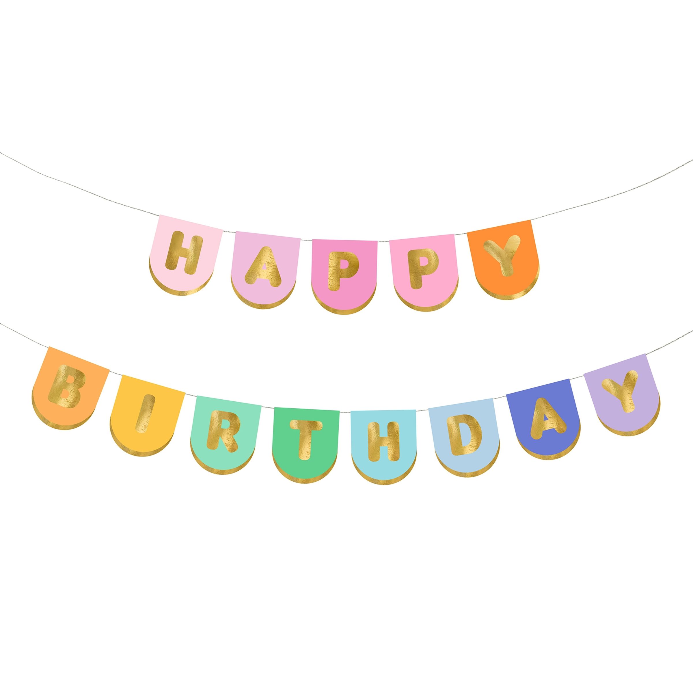 Girlang Happy Birthday Flerfärgad är en flerfärgad pappersbanner som bildar orden "Happy Birthday" skrivet med guldbokstäver. Girlangen är enkel att sätta upp med till exempel lite tejp eller mellan två krokar.