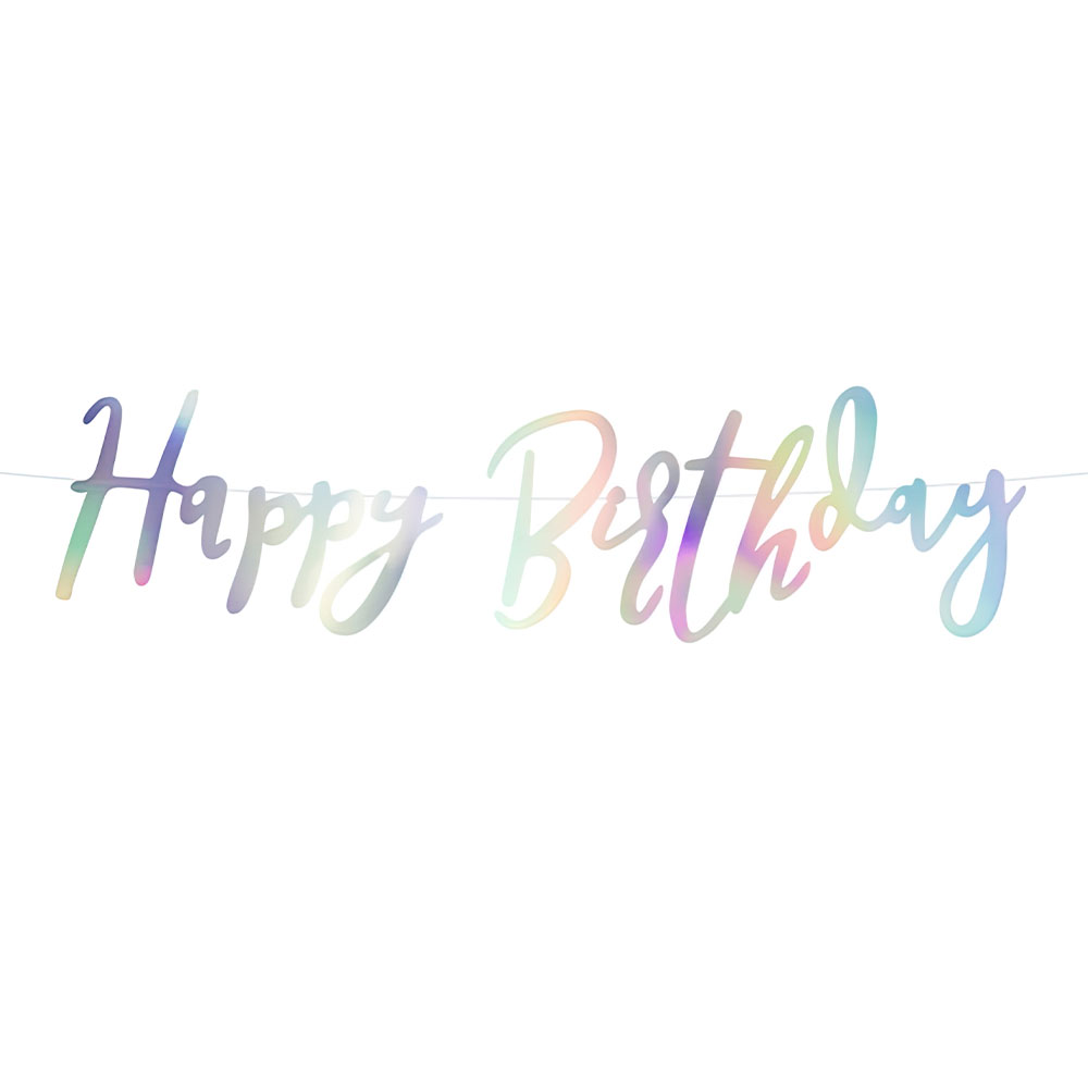 Girlang Happy Birthday Regnbågsskimrande omfattar en regnbågsskimrande girlang i papp med texten "Happy Birthday" i snirklig stil. Girlangen är ca 16,5 cm hög och 62 cm lång.