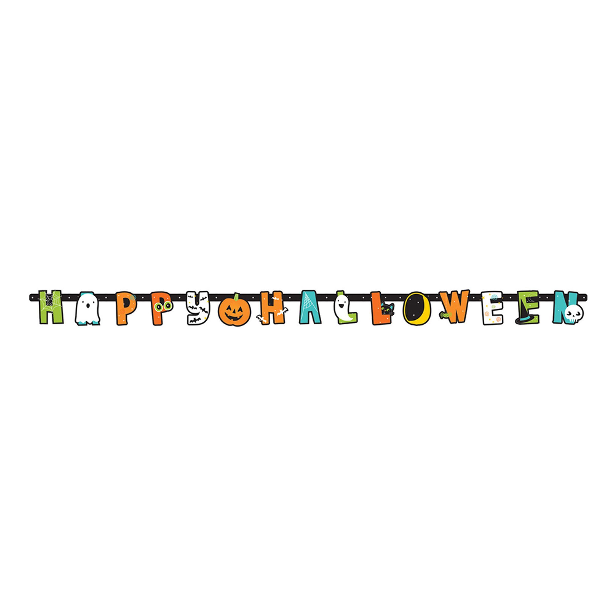 Girlang Happy Halloween Flerfärgad är en girlang med texten "happy halloween" samt olika motiv i samma tema. Tillverkad av papp och mäter ca 192 cm. Levereras styckvis. Sätts enkelt upp med tejp eller liknande.