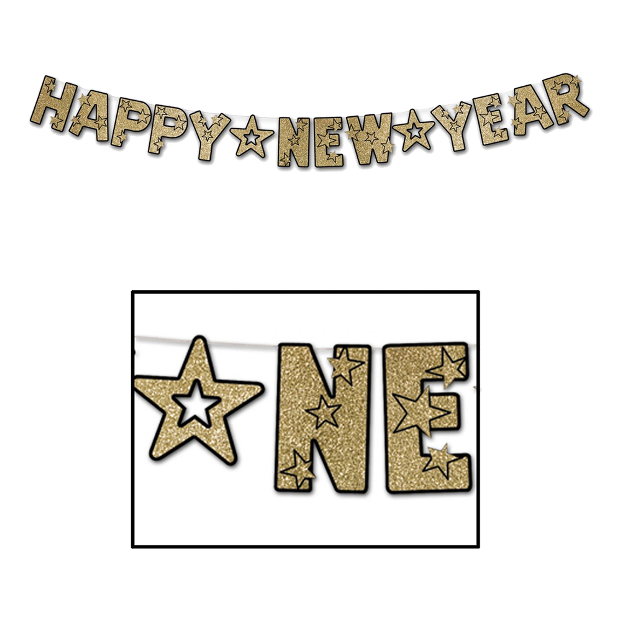 Bjud in dina vänner på ett glittrande nyårsfirande! På ett nyårsparty kan man verkligen satsa stort och dekorera med glitter och lyx. Den här glittrande girlangen med bokstäver i guld önskar alla dina gäster ett gott nytt år. Perfekt att hänga upp över det festligt dukade middagsbordet eller på en vägg.