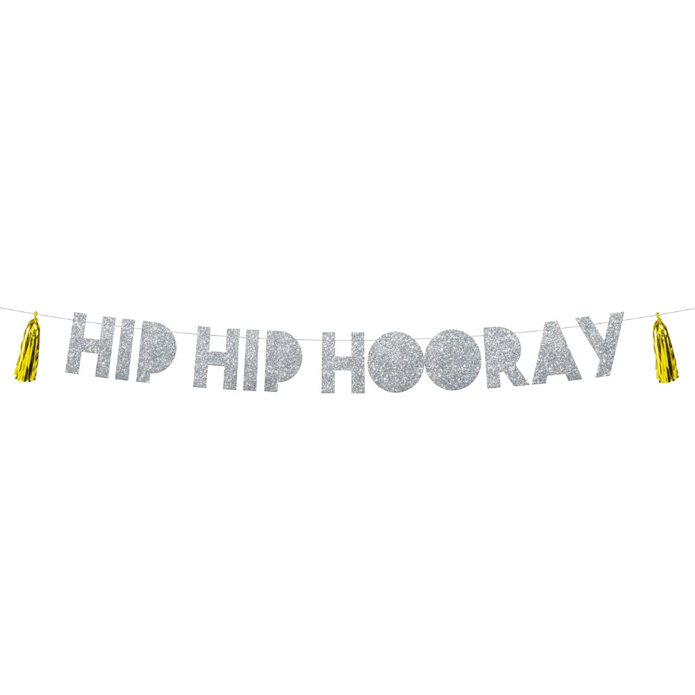 Girlang Hip Hip Hooray Glitter omfattar en glittrig bokstavsgirlang i silver med texten "Hip Hip Hooray" med guldiga tofsar i början och slutet. Girlangen är ca 1,5 meter lång och hängs upp med silvrigt snöre.