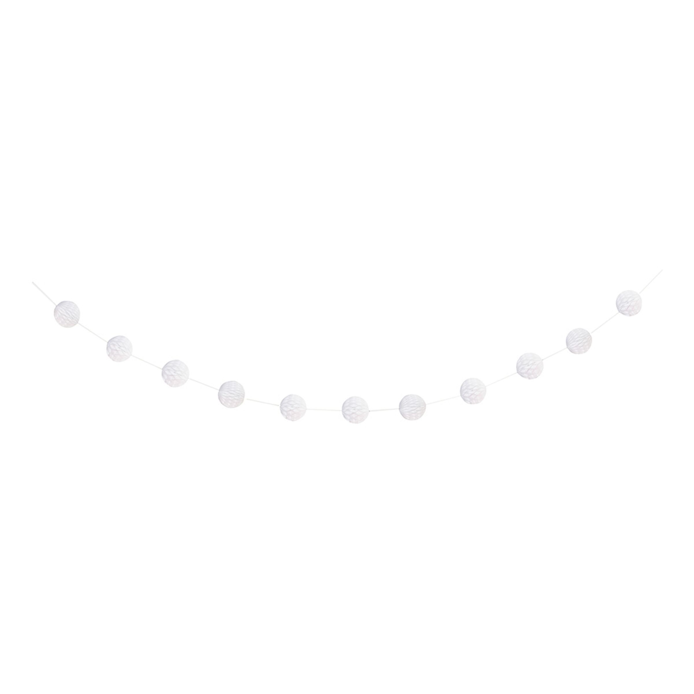 Girlang Honeycombs Vit består av en lång girlang med flera små fina honeycombs i vitt av pappmaterial.