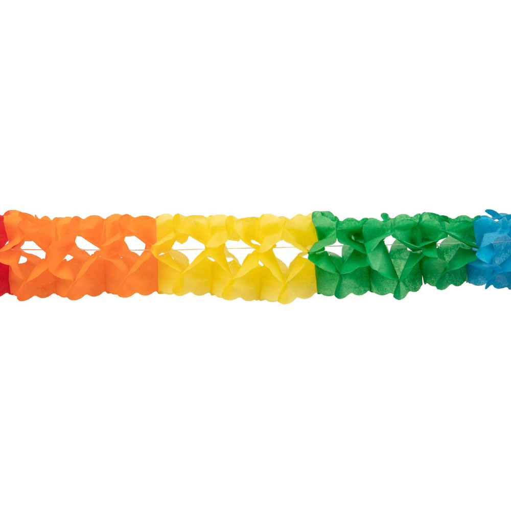 Girlang Klassisk Flerfärgad omfattar en girlang gjord av papper med vågigt mönster i olika färger. Girlangen är ca 4 meter lång.