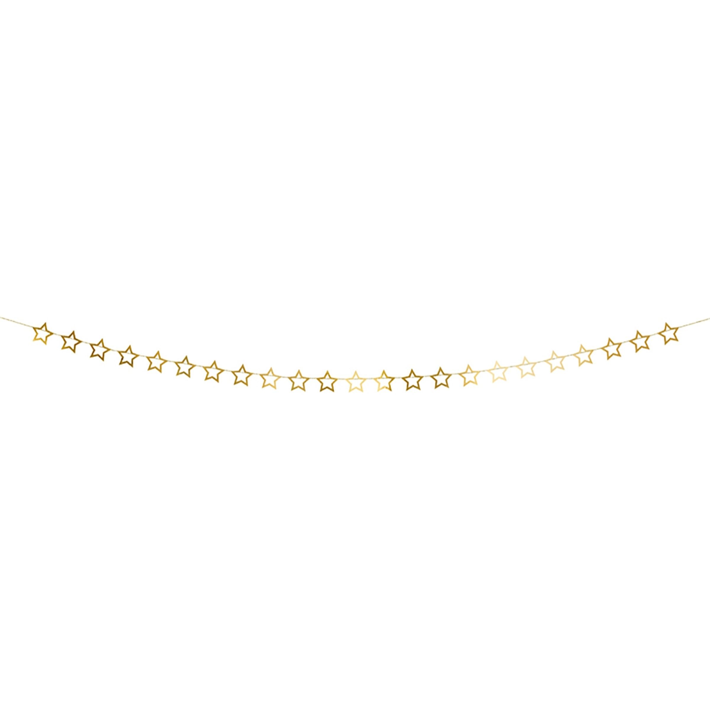 Girlang med Stjärnor Guld är en girlang av papper täckt i metallisk guldfärg som kommer formad som små stjärnor. Girlangen hängs enkelt upp med en bit tejp eller liknande.