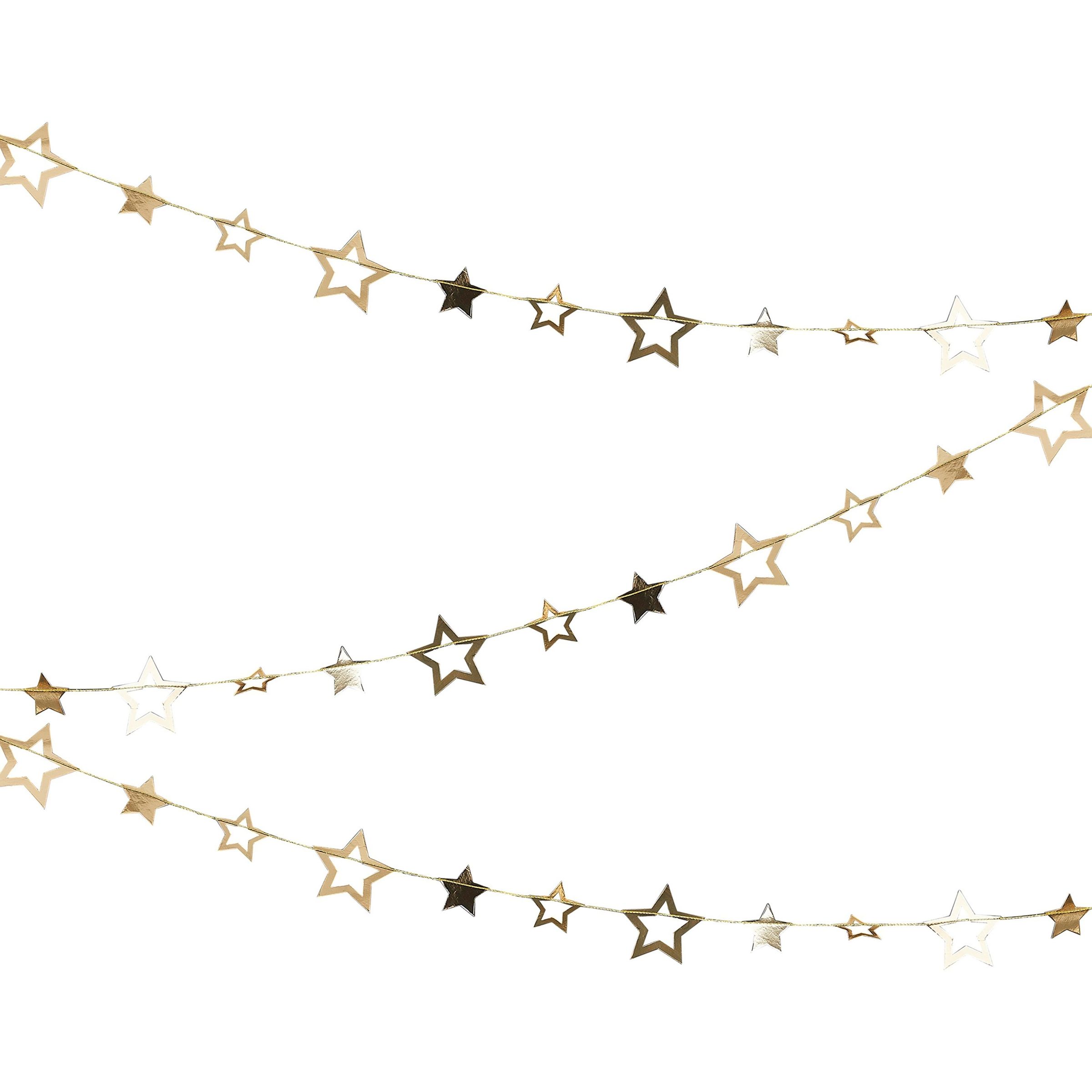 Festlig girlang med motiv av guldiga stjärnor i folie – perfekt att hänga upp till jul och till nyår, men även till födelsedagskalas och andra högtider när man vill ha det lite snyggt på väggen.