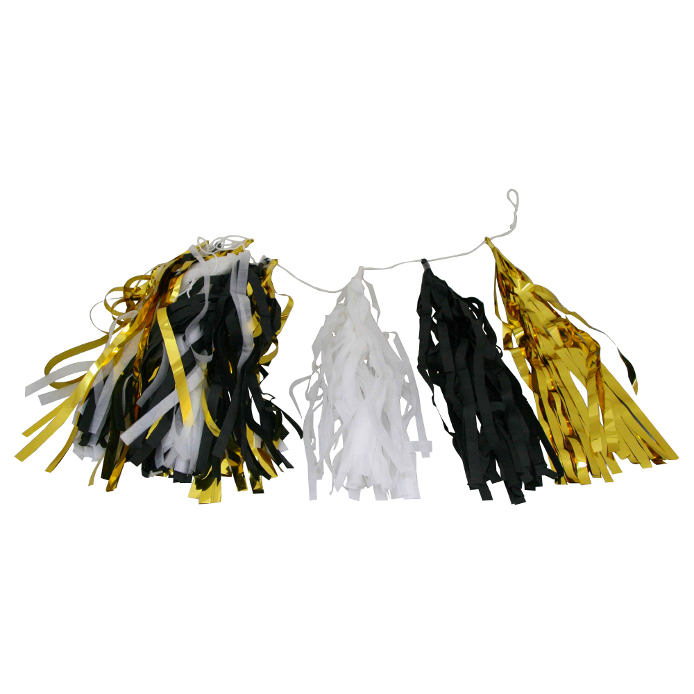 Festlig girlang med tofsar i guld, svart och vitt som passar dig som gillar härliga girlanger och tassels och som vill fira fest och födelsedag med en läcker girlang dekoration för riktig party känsla och kalas stämning. Matcha din girlang med andra härliga dekorationer och tjusigt pynt för ett firande med det där lilla extra.