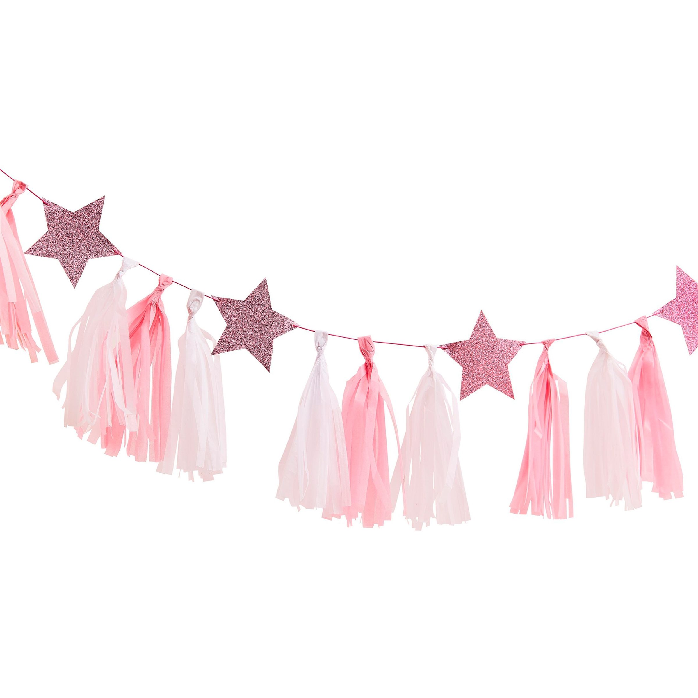 En rosa och vit girlang med tofsar och stjärnor blir en fin dekoration på en babyshower, ett dop eller ett barnkalas. Det går snabbt och enkelt att hänga upp girlangen och det blir extra fint om man kombinerar den med ballonger och konfetti i samma nyanser. Girlangen kan även bli en fin inredningsdetalj i ett barnrum.