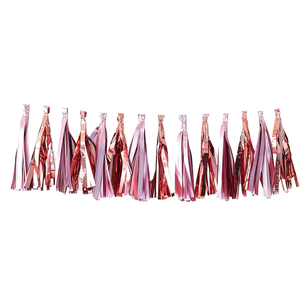 Girlang med Tofsar Rosa och Roséguld omfattar en girlang med 16 tofsar i matt rosa och skimrande roséguld. Girlangen är tillverkad av plast och är ca 1,5 meter lång.
