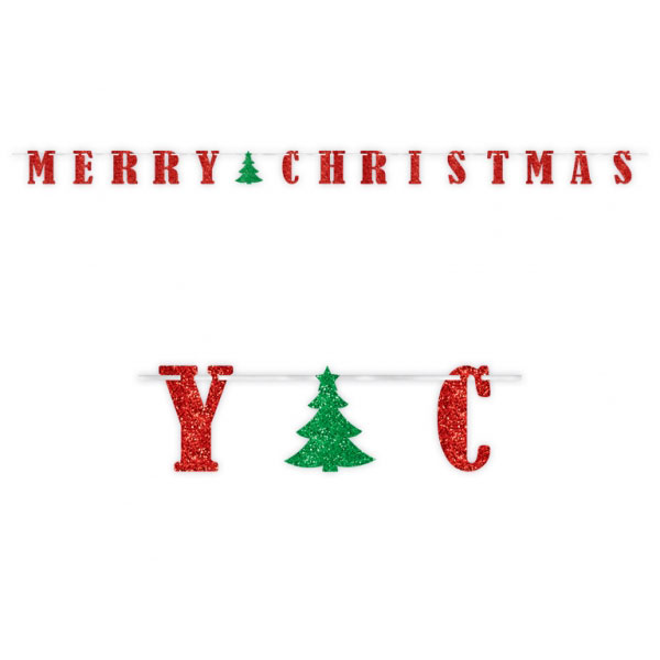 Girlang Merry Christmas Glitter omfattar en pappersgirlang med texten "Merry Christmas" i rött glitter samt en grönglittirg gran i mitten. Girlangen hängs upp med ett vitt skimrande band som är ca 3,65 meter lång.