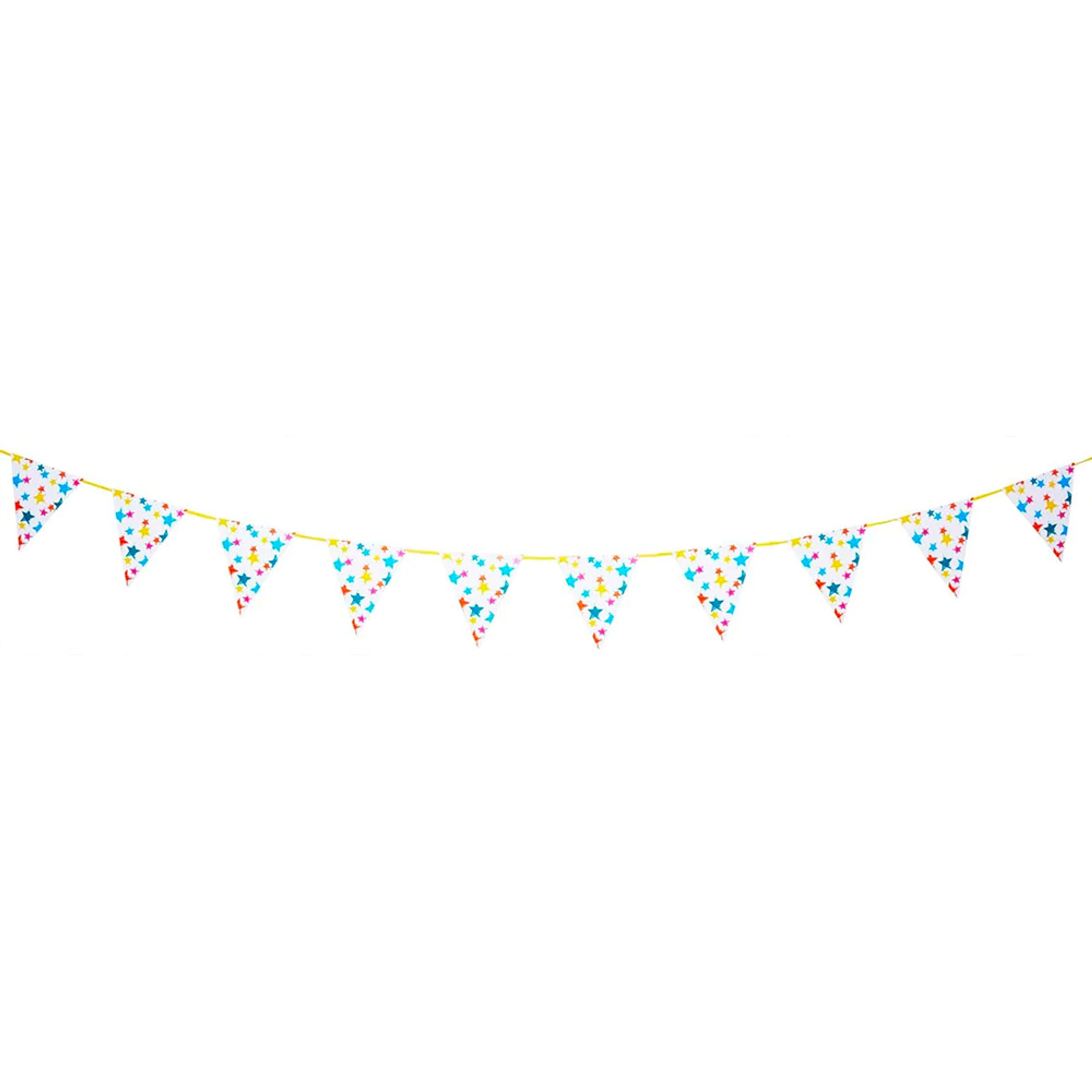 Girlang Rainbow Star innehåller en girlang med 12 triangelformade flaggor fyllda med färgglada stjärnor. Passar perfekt att hänga upp längs med väggen på kalaset eller i barnrummet, eller häng upp det ute i trädgården!